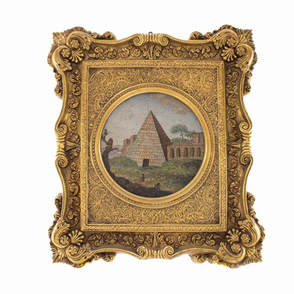 Roma, fine XVIII-inizio XIX Sec. raffigurante Piramide di Caio Cestio, entro cornice in metallo dorato