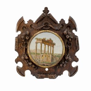 Roma, fine XVIII-inizio XIX Sec. raffigurante Veduta del Tempio di Saturno, entro cornice in legno intagliato