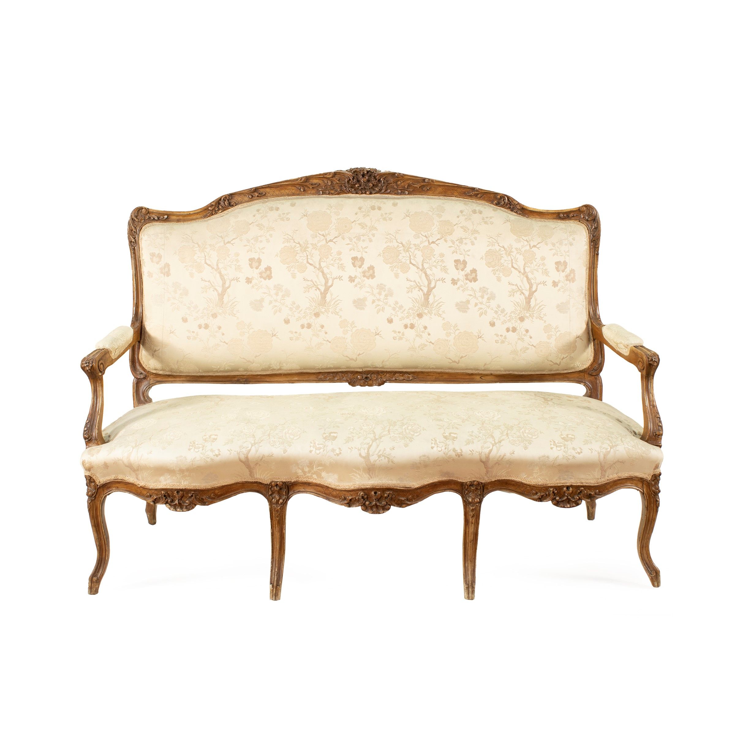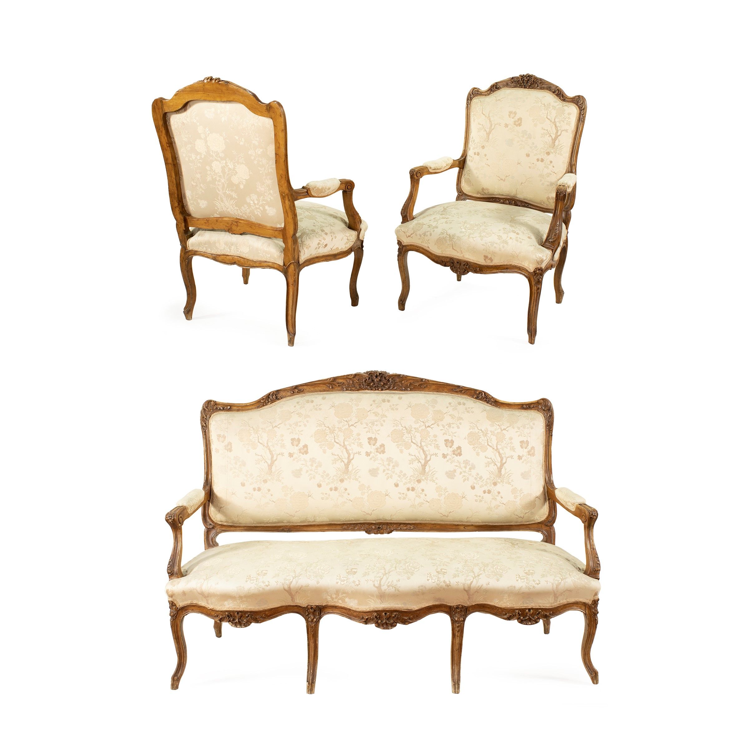Francia, XIX Sec. corpi intagliati con motivi floreali e volute vegetali, sedute e schienali imbottiti in tessuto, composto da un divano e due poltrone, lievi difetti