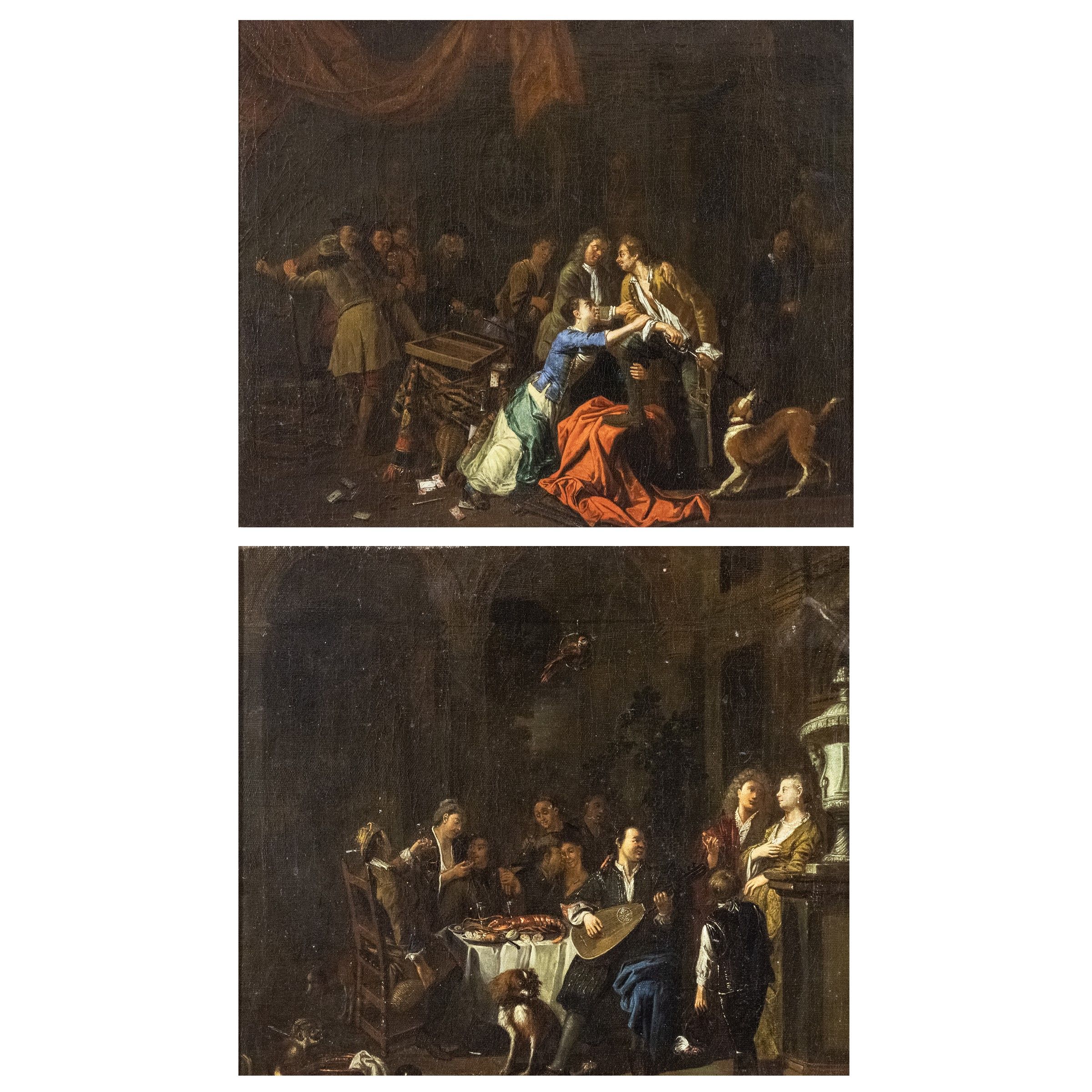 XVIII Sec. Scena di banchetto - Rissa in taverna, coppia di oli su tela, entro cornici
