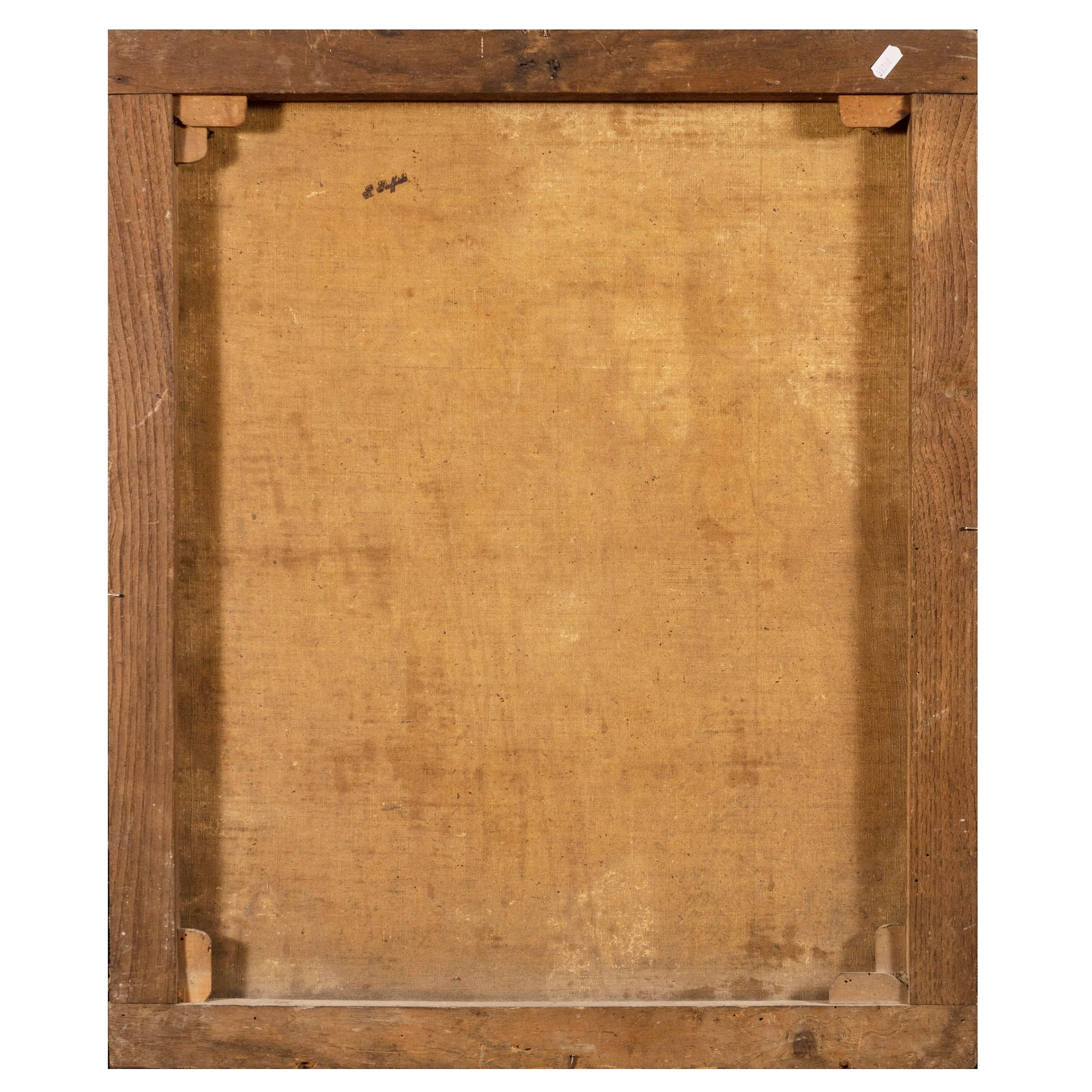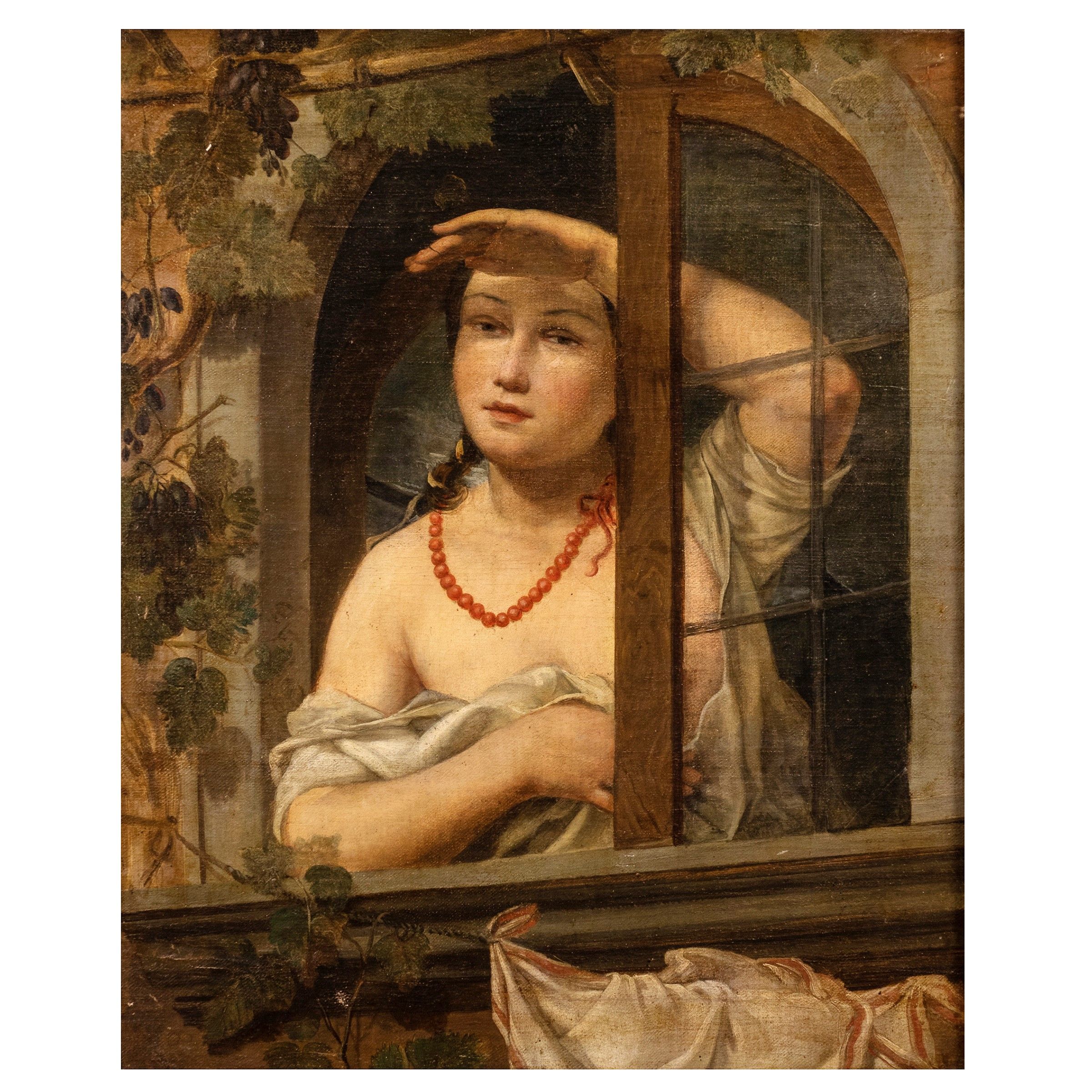 XIX Sec. Donna alla finestra, olio su tela, entro cornice