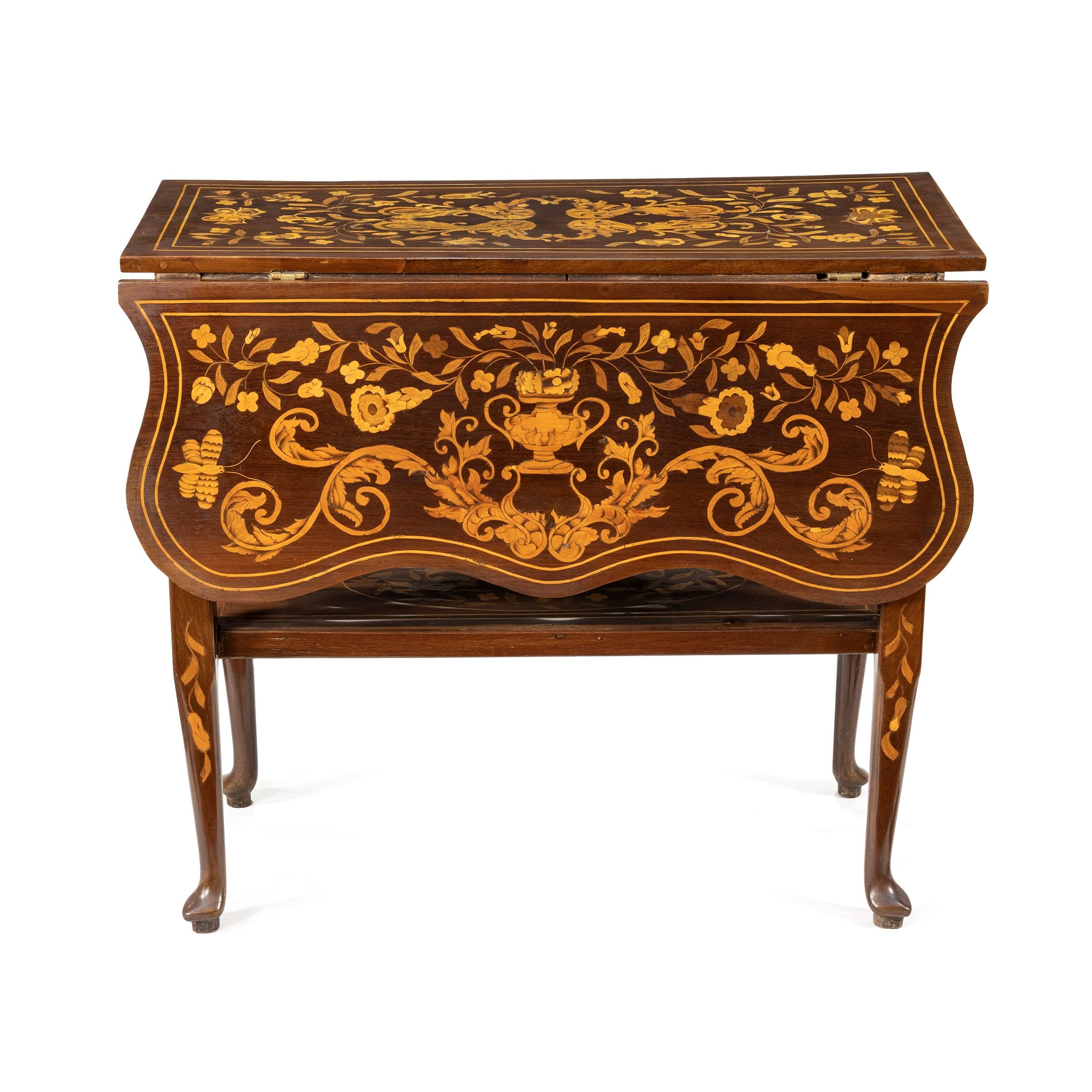 Olanda, XVIII-XIX Sec. corpo intarsiato con motivi vegetali e floreali, piano sagomato poggiante su gambe riunite al centro da un ripiano, lievi difetti