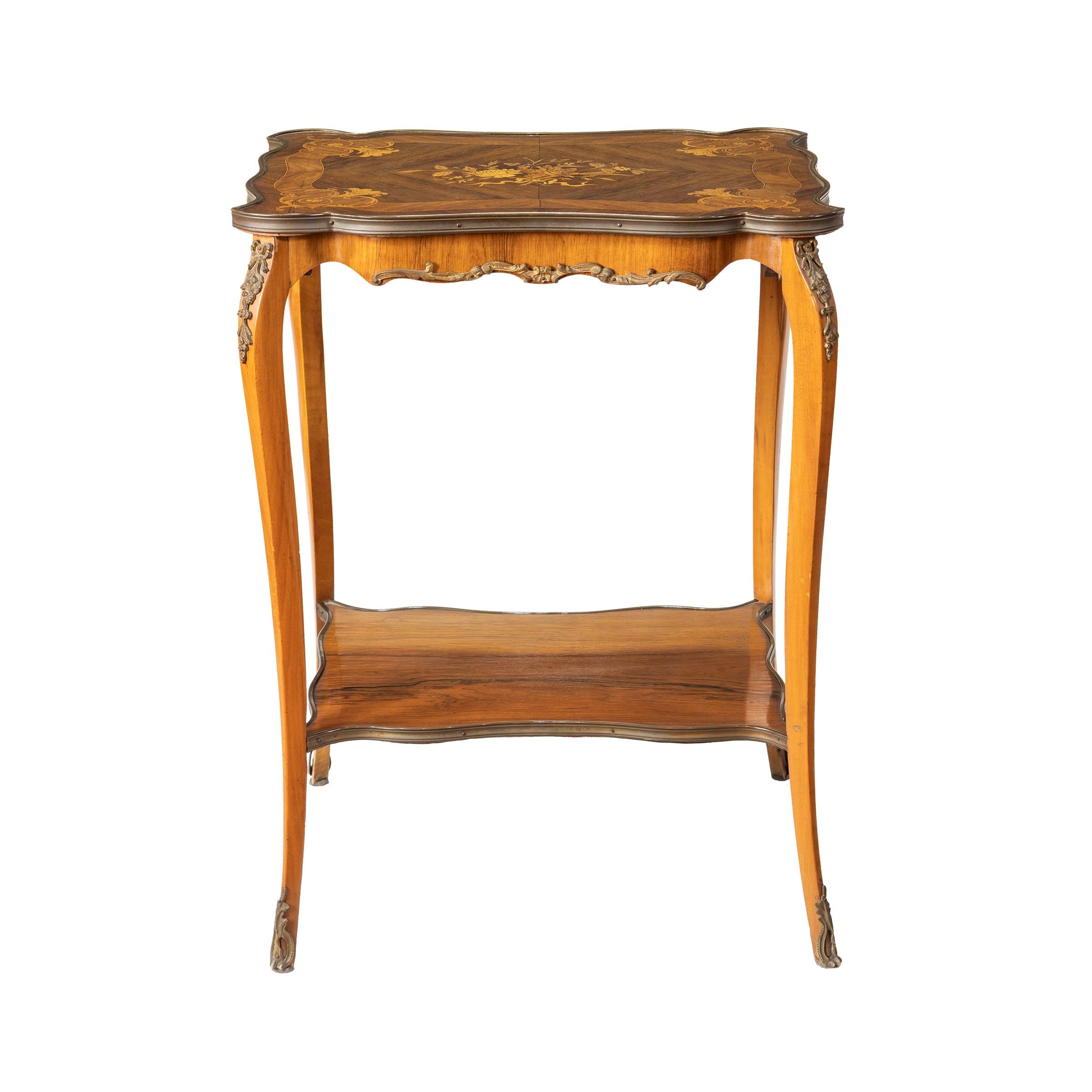 Francia, XIX - XX Sec. piano sagomato intarsiato con motivi floreali e vegetali, poggiante su sostegni sagomati riunite al centro da un ripiano, fregi in bronzo cesellato,