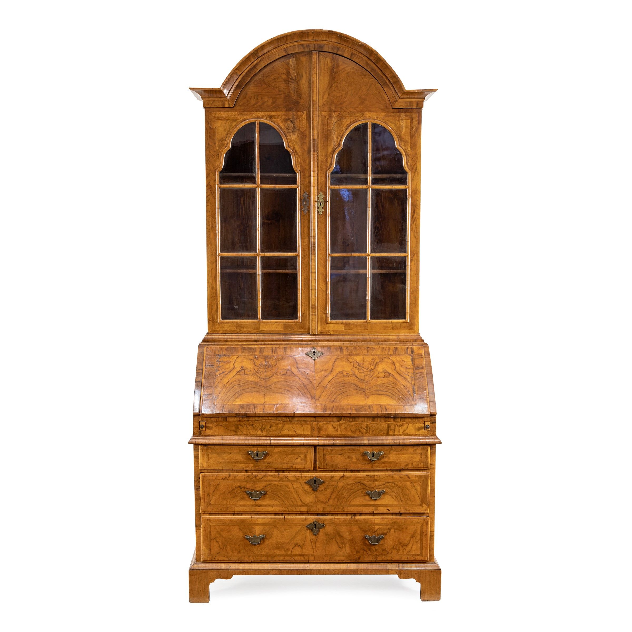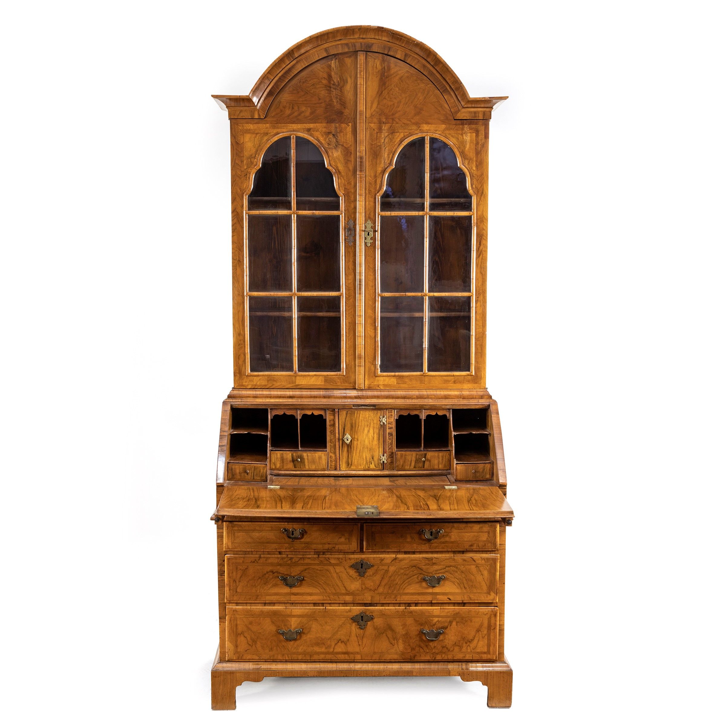 Inghilterra, XVIII Sec. base a tre cassetti su piedi a mensola, scarabattolo interno con tiretti, vani a giorno e sportello centrale, alzata con ante a vetro e cimasa ad arco