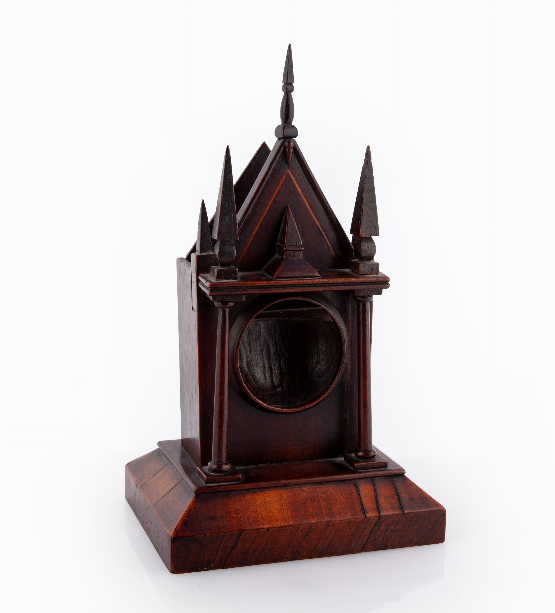 Porta orologio da tavolo in legni vari a forma di tempietto neogotico