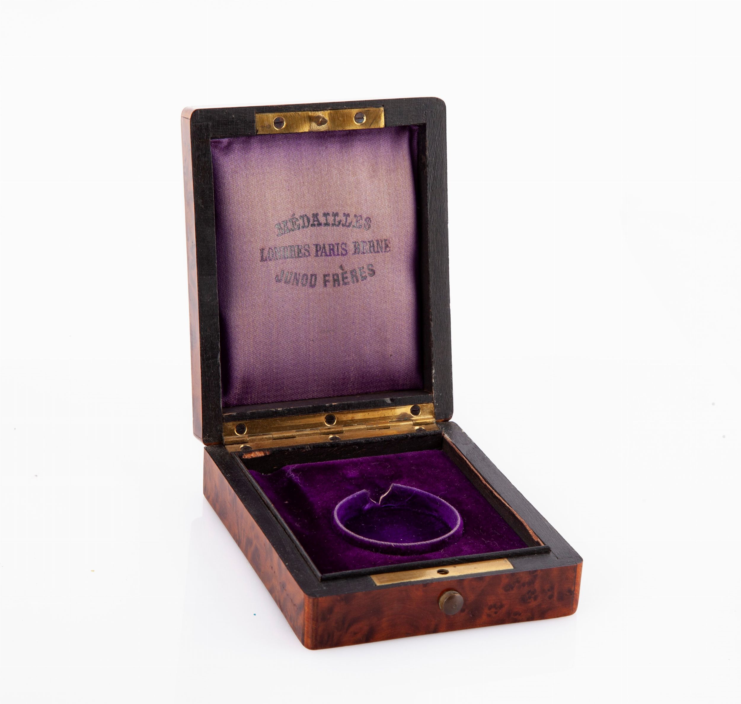 Scatola Porta orologio in legno e radica con stemma e filettature in metallo