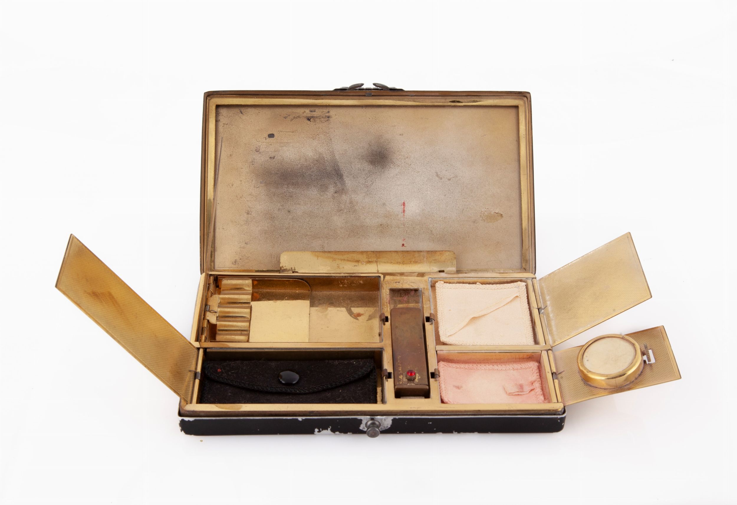 Trousse in ottone e metallo con orologino a carica remontoir. Con portarossetto, [..]