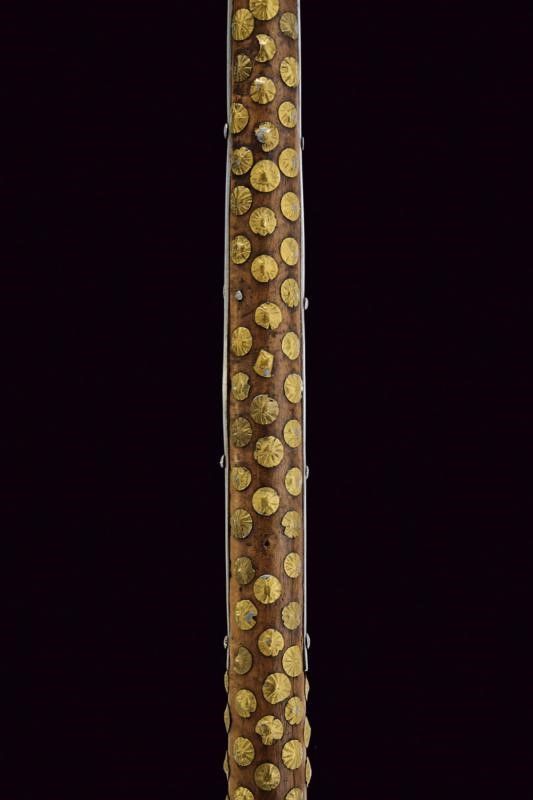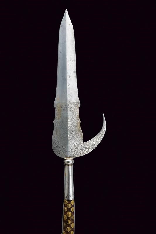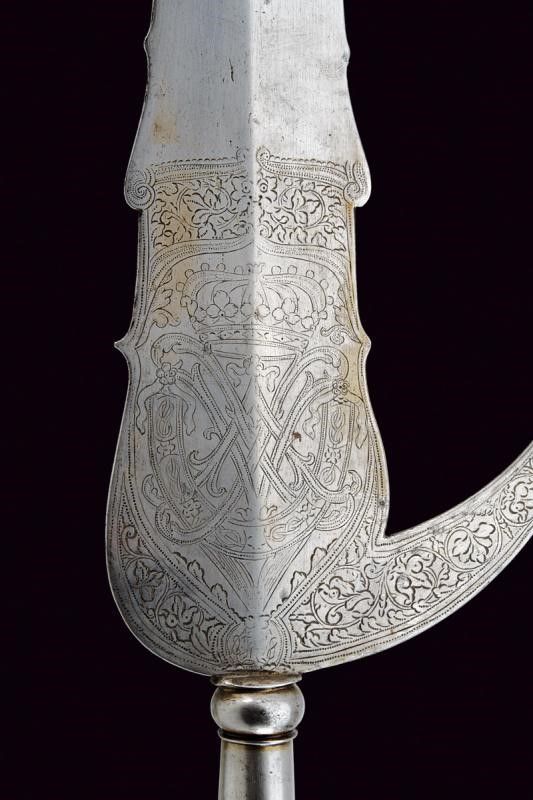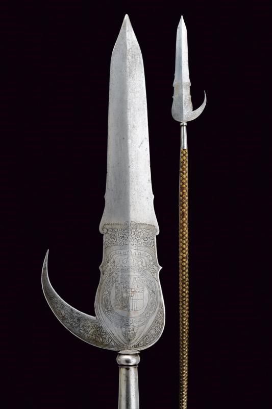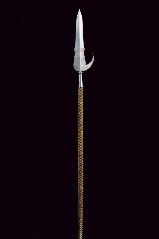 Regno di Sardegna, altezza 223 cm. 1700 circa Cuspide a lama a due fili costolata in mezzeria, con bordi convessi alla base, recante un'unica ala a mezzaluna, finemente incisa su una faccia con il monogramma VA sotto corona fra disegni floreali, e sull'altra con stemma reale circondato dalla collana dell'Ordine Supremo della Santissima Annunziata sotto corona e fra disegni floreali. Gorbia cilindrica con bandelle. Asta antica rivestita di borchiette e rosette in ottone.
