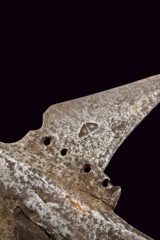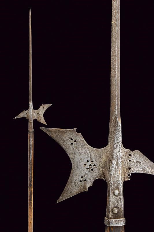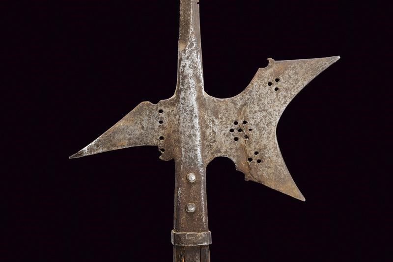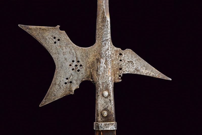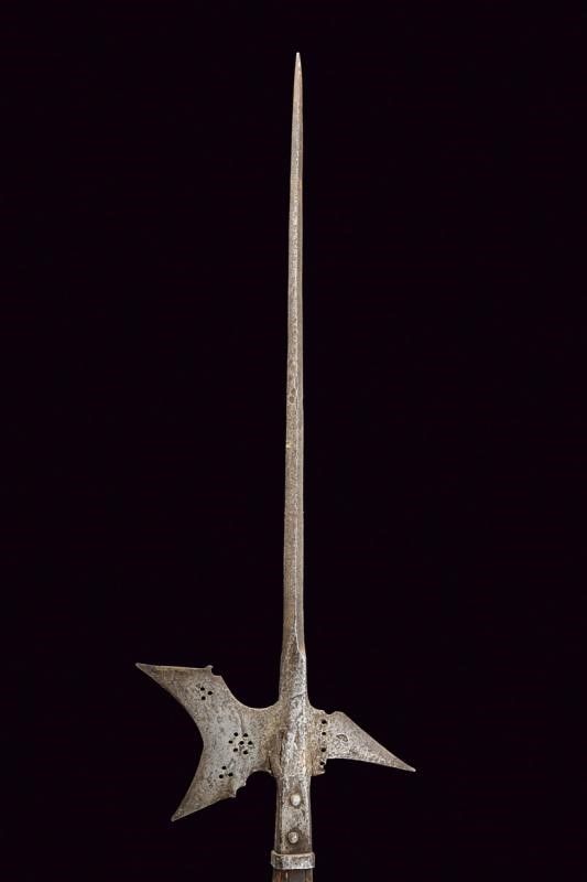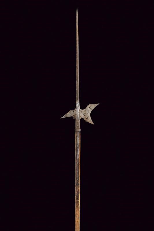 Austria, altezza 218 cm. Fine del XVI Secolo Ferro con lunga cuspide a quadrello leggermente allargata alla base, scure fortemente incavata con gobbe ai dorsi e sforature circolari (crepa e danni al collo della scure), becco leggermente incurvato e con resti di punzone. Bandelle dritte, con ribattini in ferro, ben incassate. L'asta lignea di produzione non recente.