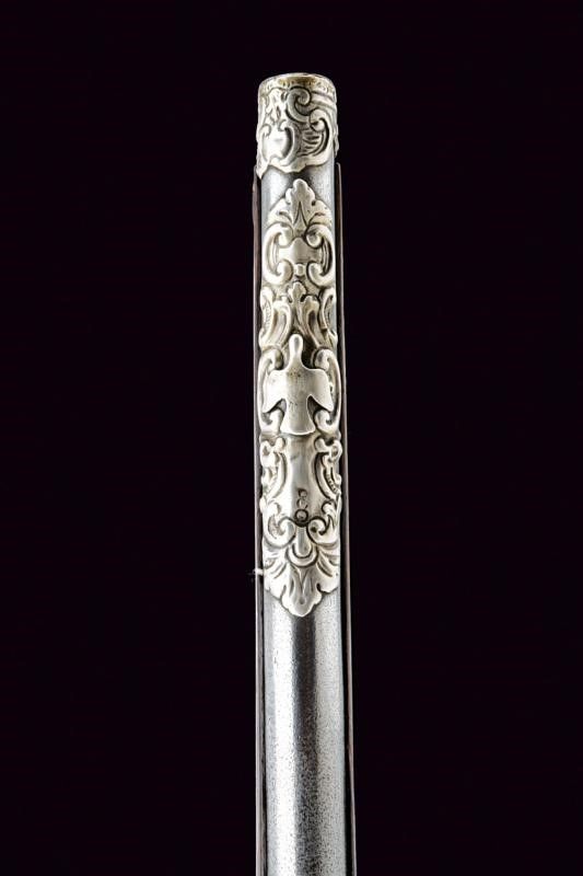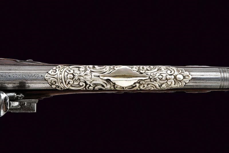 fine del XVII Sec. Canna liscia a tre ordini; la prima parte ottagonale con cornice, firma LAZARINO COMINAZZO e decoro a righe longitudinali, la seconda parte esadecagonale, l'ultima tonda dopo tre anellature. La canna decorata con tre fornimenti in argento recanti ornamenti floreali e geometrici, il fornimento alla base munito di traguardo, il mirino posizionato nel secondo fornimento, a forma di volatile; il calibro in volata 15 mm, la codetta incisa. Batteria a pietra focaia riccamente intagliata con mascheroni, figure grottesche, serpenti e a motivi floreali; la coda della molla esterna a cuore traforato, il copriscodellino scorrevole decorato a busto. All'interno la firma Ottaviano Pozzi Sabione. Cassa intera in legno (crepa nella guancia destra e alcuni piccoli restauri), scolpita a motivi floreali al centro e sulla pala. Bei fornimenti in ferro intagliato e parzialmente traforato. La contropiastra con medaglione al centro recante un busto femminile tenuto da due figure grottesche e con serpenti. Ponticello con un busto dotato alle due estremità di decori a fogliame. Il calciolo decorato con due busti e decori floreali, la parte posteriore con danni da ruggine. Bacchetta in ferro munita di cavastracci.