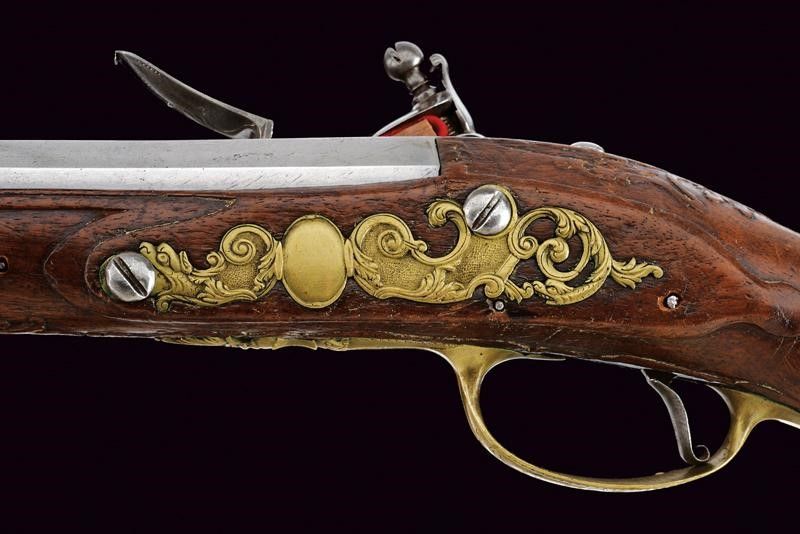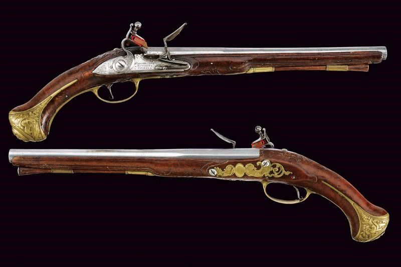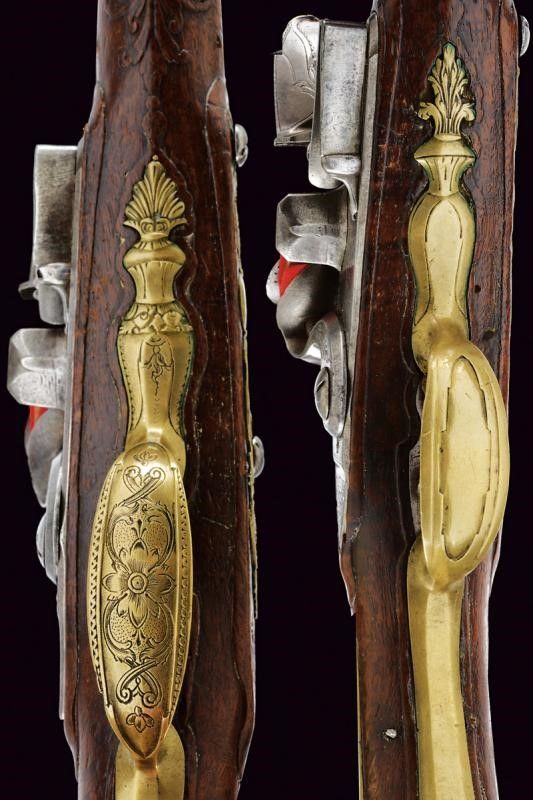 Francia, lunghezza 49.5 cm. secondo quarto del XVIII Sec. Canne lisce a due ordini, prima ottagonali poi tonde prive di anellature, in calibro 15.6 mm; codoli incisi a motivi floreali. Batterie con cartelle piatte a codetta ribassata e con bordi obliqui, firmate BARTHELEMI ROVSSET A PARIS; tutti gli elementi con cornicette ai bordi. Il collo dei cani e le codette delle cartelle con fiorami e rocaille. Casse intere in legno leggermente scolpite (piccole mancanze). I dorsi dei calci con resti di tarsie in filigrana. Fornimenti in ottone. Ponticelli (uno sostituito) con decori floreali. Belle cocce con grande mascherone in rilievo al centro e trofei d'armi e bandiere sui fianchi su fondo granulato. Bacchette in legno, una con battipalla in ferro.