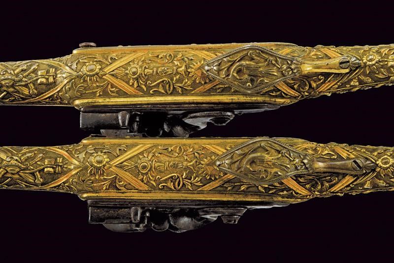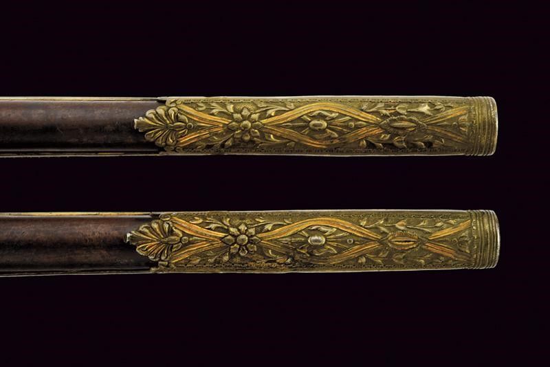 Inizio del XIX Secolo Canne lisce a tre ordini; la prima parte ottagonale leggermente incisa a motivi floreali e decorata con placche in ottone, quella dorsale incisa e con decoro ad imitare una firma, gli altri due ordini tondi suddivisi da anellature, quello fra il primo ordine e il secondo rimesso in ottone, cal. 15 mm. Codette con placca d'ottone, incisa e munita di traguardo. Batterie alla moderna con bordi incisi, munite di sistema antifrizione e a tenuta stagna. Bellissime casse intere in metallo bianco dorato (argento?), incise e intagliate a motivi floreali e a trofei. I ponticelli con bel volatile lavorato in bassorilievo, particolare che si trova anche sui fianchi dei calci. Interessanti cocce a turbante con motivi floreali, con estremità a mascherone. Meccanica funzionante. Rare.