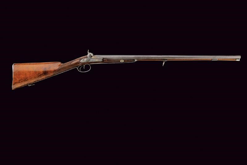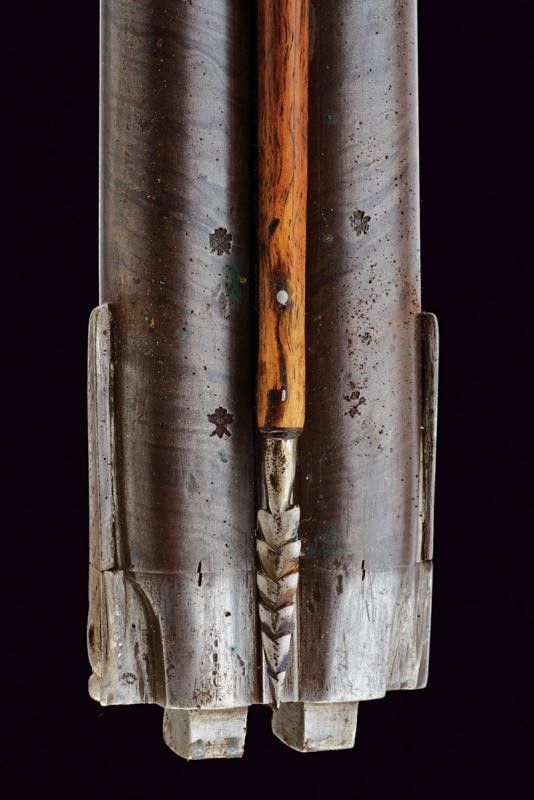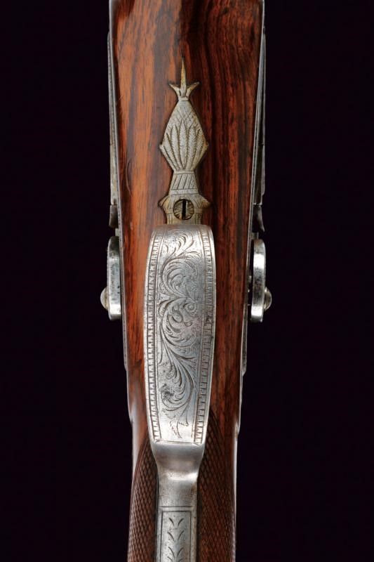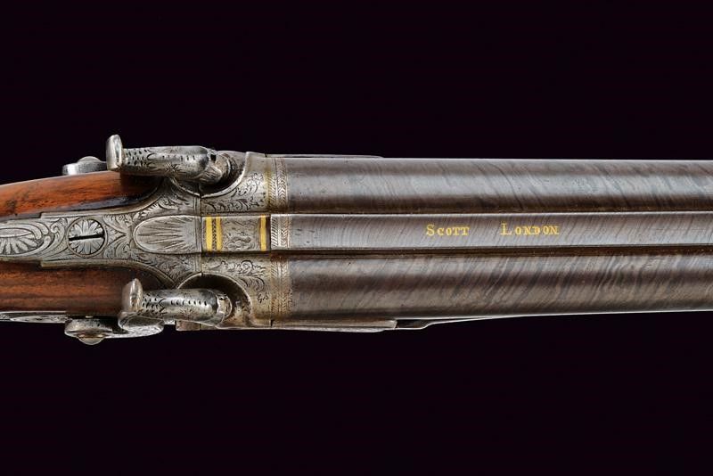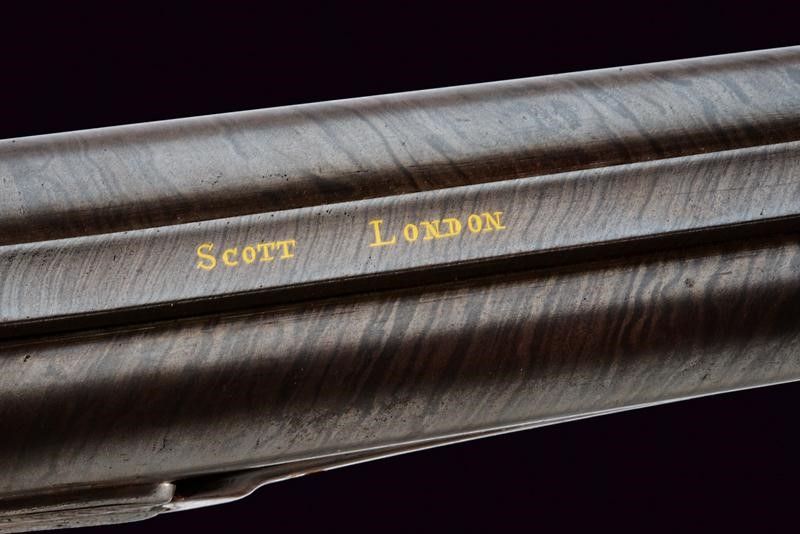 Metà del XIX Secolo Canne lisce, tonde, giustapposte, in damasco, brunite, con bindella (alla base leggermente staccata) firmata in oro SCOTT LONDON; incisioni alla base e cornici in oro, mirino; il lato inferiore con punzoni del banco di prova, cal. 16 mm in volata; codetta incisa. Batterie a molla in avanti, firmate Scott e finemente incise a motivi floreali; mezza cassa in radica con collo zigrinato, fornimenti in ferro incisi en suite; bacchetta in legno con cavastracci in ferro e battipalla in metallo. Due anelli per la cinghia.