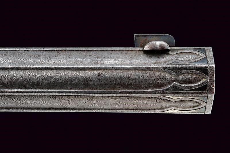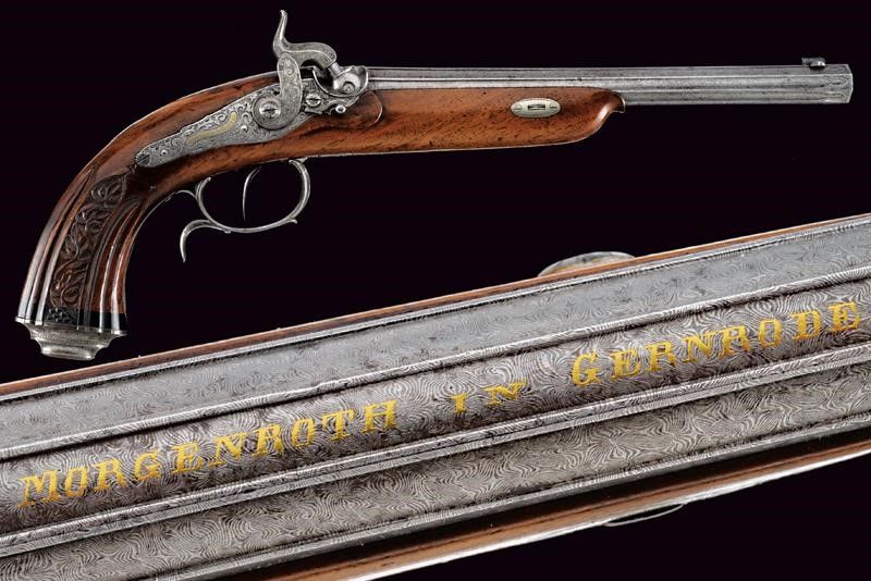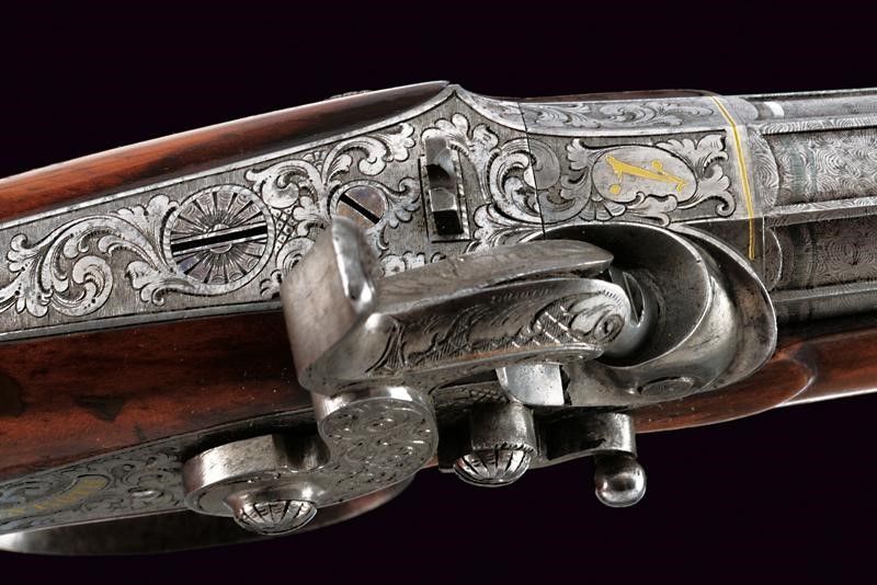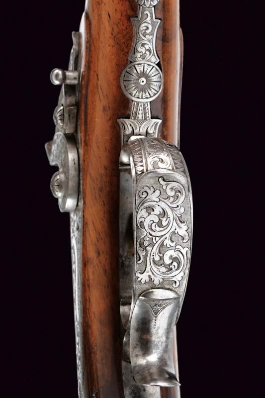 1840 circa Canna tonda rigata, con otto nervature longitudinali, in fine damasco, firmata MORGENROTH IN GERNRODE in oro, dotata di mirino, cal. 12 mm; base e codetta finemente incise a racemi, numerate 1 e dotate di alzo regolabile. Batteria a molla indietro firmata MORGENROTH in oro, incisa en suite e munita di sicura; cassa in radica, con calcio scolpito a fiorame e scanalato, recante l'estremità inferiore in corno, fornimenti in ferro incisi en suite, ponticello con poggiadito, stecher.