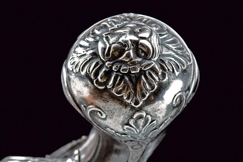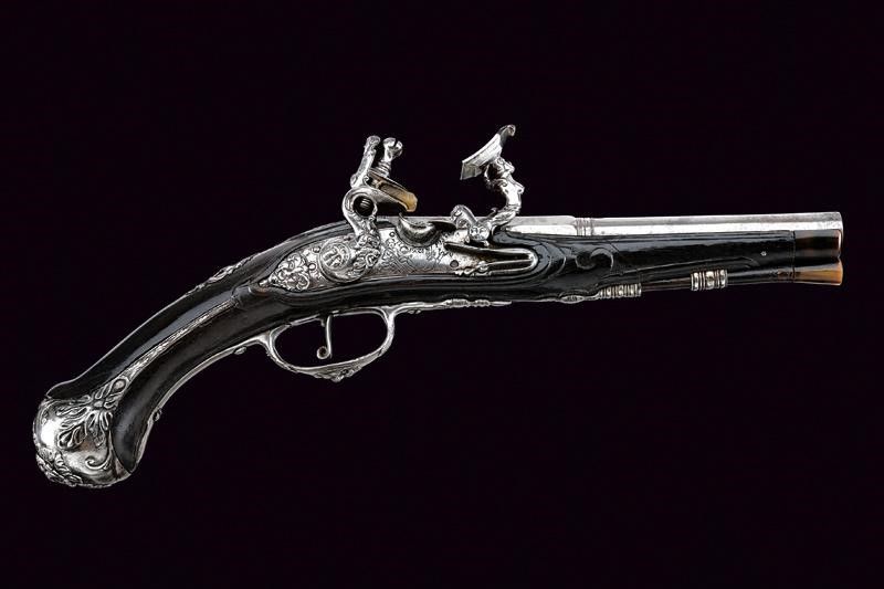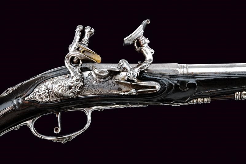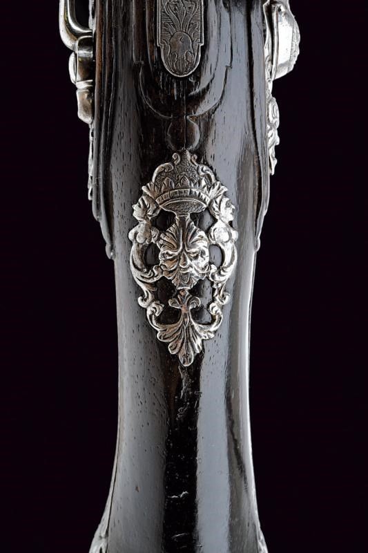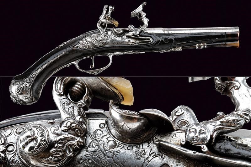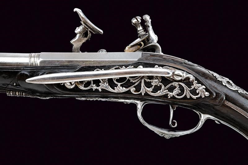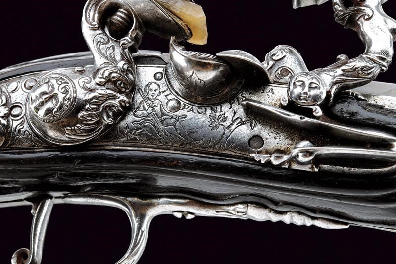 primo quarto del XVIII Sec. Canna liscia a due ordini, prima ottagonale, con marca rimessa in oro, poi tonda con due anellature lisce ed una perlinata al cambio; la volata incisa, calibro 12.5 mm; codetta finemente incisa. Batteria a pietra firmata attorno allo scodellino IL PACINI PISTOIA, magistralmente intagliata ed incisa; la cartella decorata con un viaggiatore che si riposa su una roccia davanti ad un albero, la coda con mascherone, il cane con volto barbuto, il dorso del cane con un busto. Quando il cane viene armato sotto ad esso compare una figura muliebre incisa, il fusto della martellina lavorato a cariatide femminile a tuttotondo, il copriscodellino scorrevole decorato con un mascherone. Cassa intera in legno scuro leggermente scolpito (alcune crepe). Fornimenti in acciaio, intagliati e parzialmente traforati; la contropiastra con un piccolo volto fra il fogliame; il ponticello con testa di leone in rilievo, fregio che si ripete sulla coccia ove è incorniciato foglie. Gancio da cintura. Bacchetta in legno con battipalla in corno.