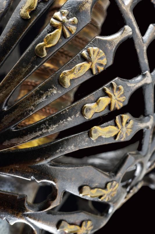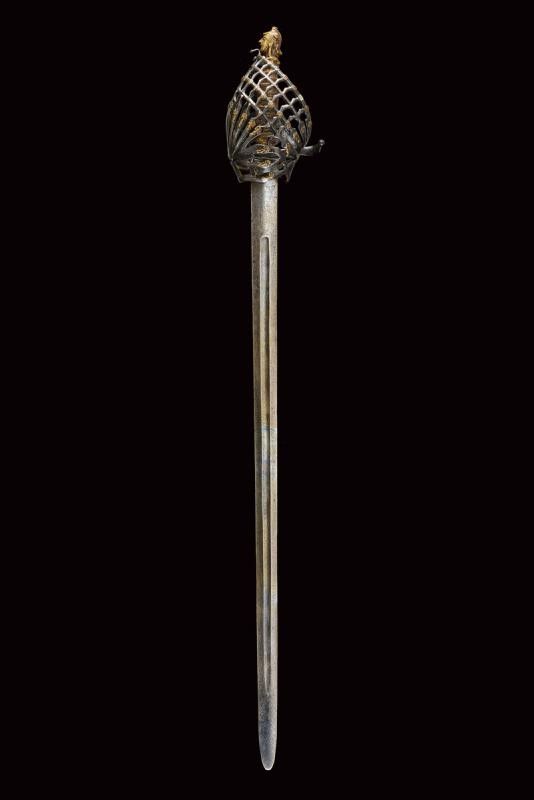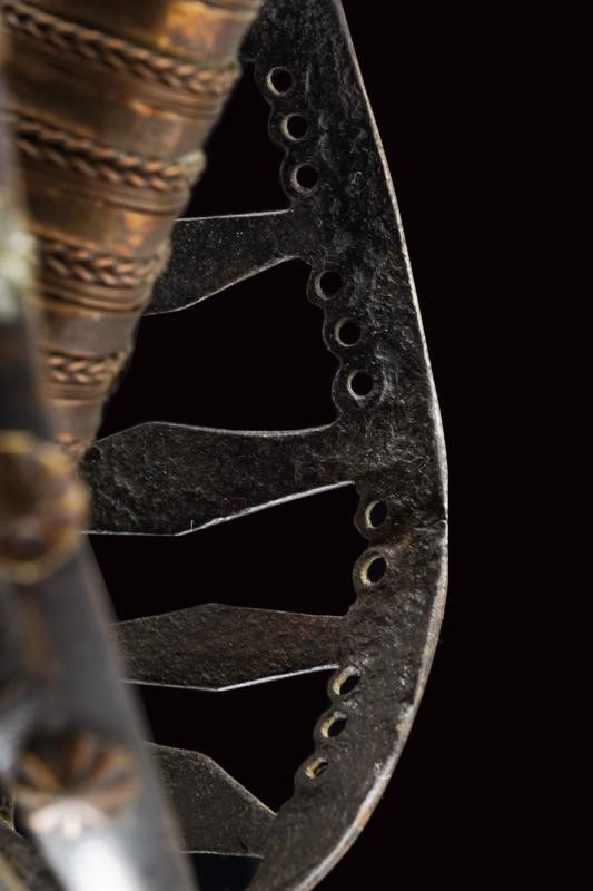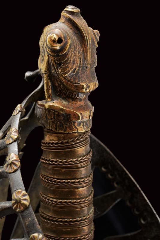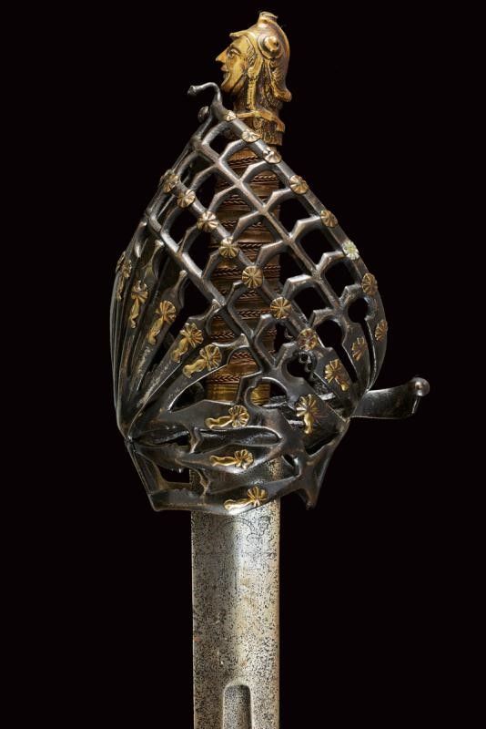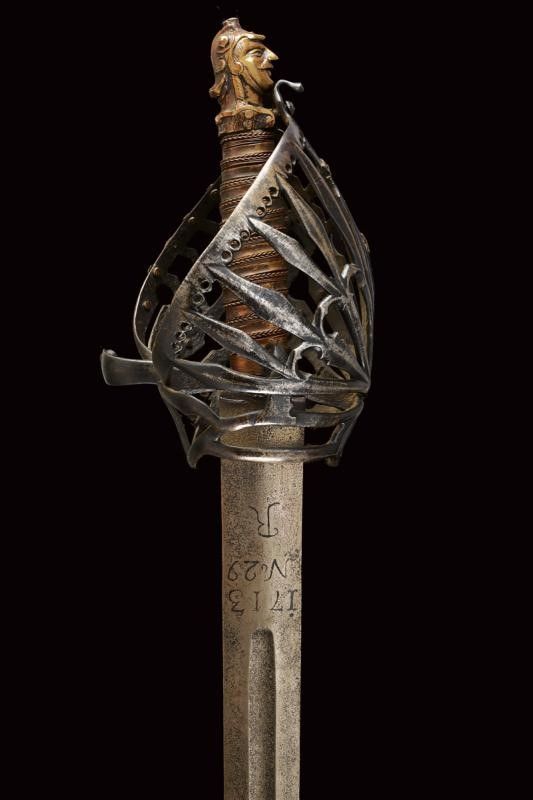 Repubblica di Venezia, lunghezza 109,5 cm. 1713 Robusta lama dritta di sezione lenticolare, recante nel segmento centrale un lungo sguscio che si interrompe a circa 10 cm. da punta e base. Sul lato di terza al forte incisione di un emblema purtroppo quasi completamente svanito, l'unico elemento ancora visibile un collare con pendenti. Sul lato di quarta la data 1713 e N. 29 R. Elegante fornimento in ferro a gabbia effigiante il leone di San Marco stilizzato. Il lato anteriore arricchito con fornimenti in ottone dorato decorati a rosette (una mancante). Impugnatura con rivestimento a spirale di piattina in rame alternata a trecciole. Il pomo in ottone a testa di guerriero lavorata a tuttotondo.