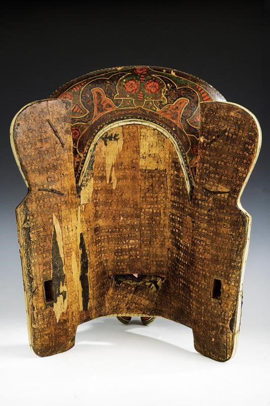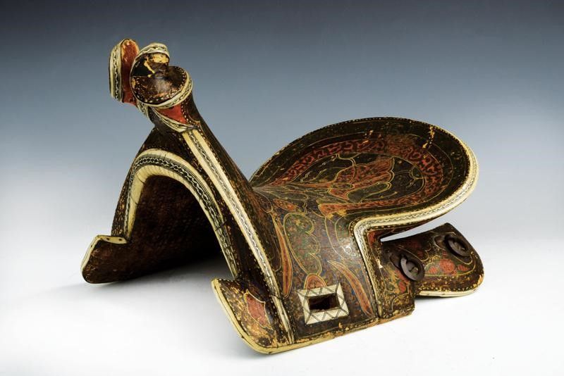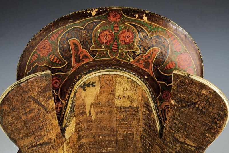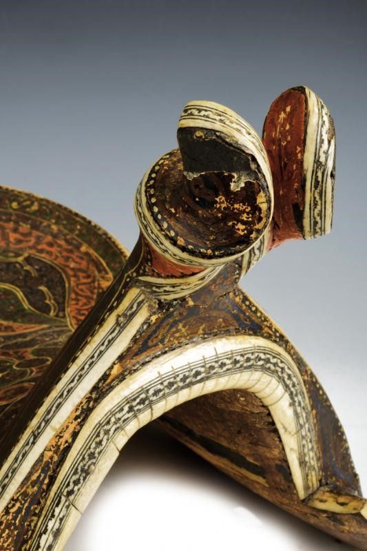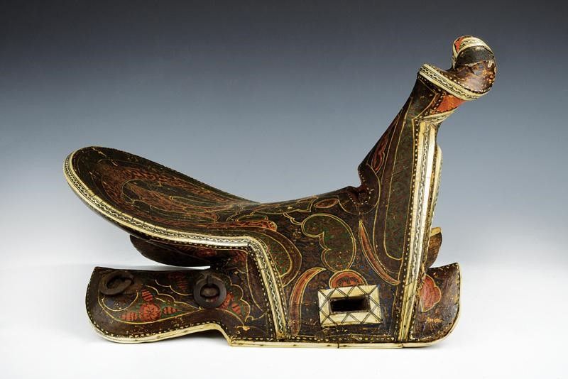 Rajasthan, altezza 29 cm. XVIII Secolo Struttura lignea con bordi e finestre decorati in osso inciso a motivi geometrici. Tutta la superficie riccamente decorata a fantasie floreali e geometriche in policromia. Il pomolo a due orecchie. Sui lati finestre per il fissaggio, nella parte posteriore anelli in ferro su basi a forma di fiore per le cinghie. La parte inferiore rivestita di carta marrone. Piccoli difetti e mancanze. Di alta qualità.