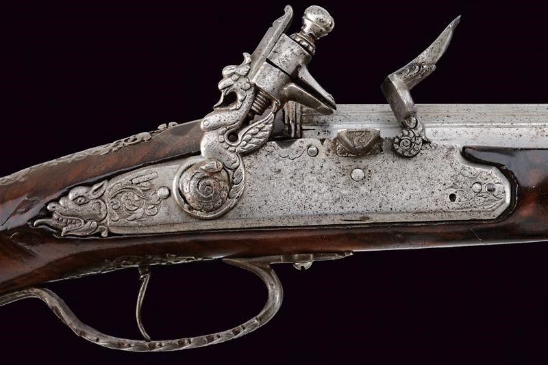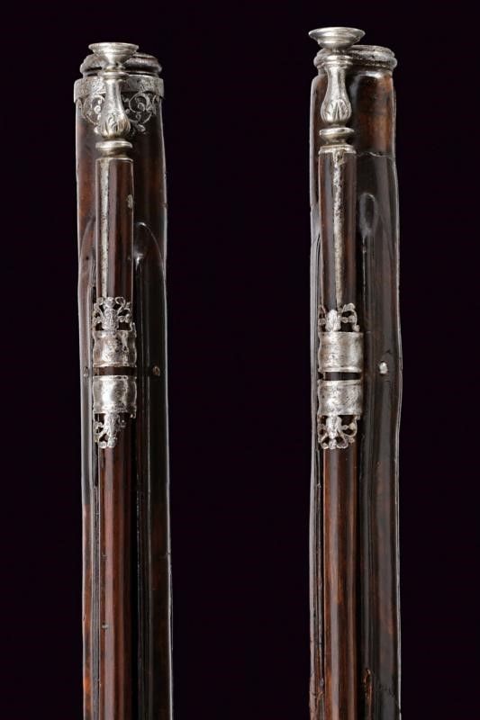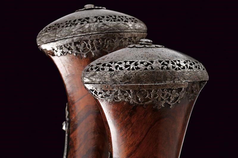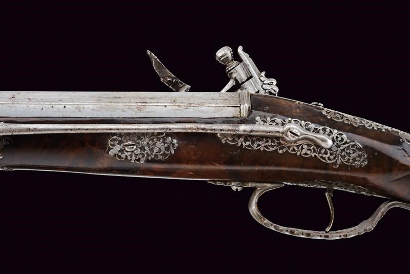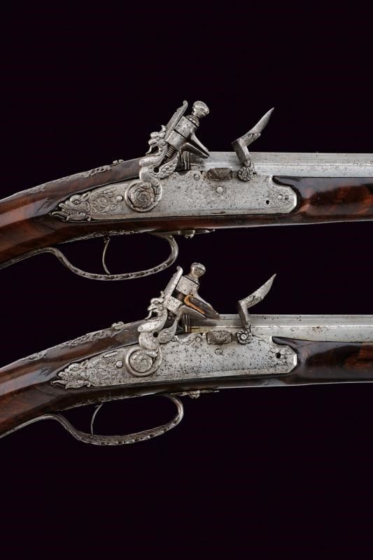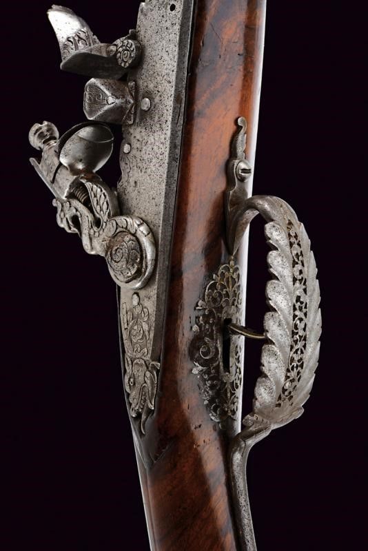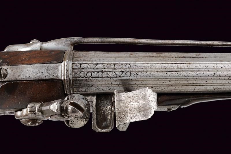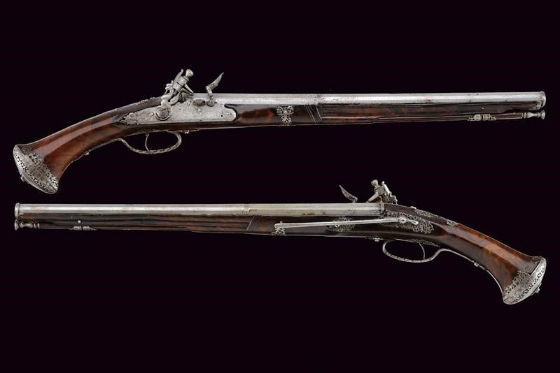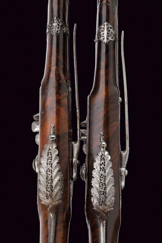Brescia, lunghezza 58 cm. XVII Secolo Lunghe canne lisce a due ordini, prima ottagonali con scanalature longitudinali, firmate LAZARINO COMINAZO, poi a sedici facce con anellature al cambio e gioia di bocca, cal. 13 mm. Batterie a pietra focaia, con codetta intagliata a mostro, i cani a chimera, la vite del cane a serpente. Casse intere in radica (restauri) con finissimi fornimenti in acciaio lavorati in filigrana a motivi floreali (piccole mancanze). Bacchette in legno con battipalla in ferro.