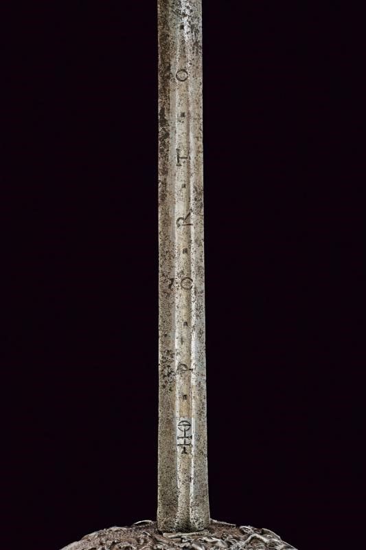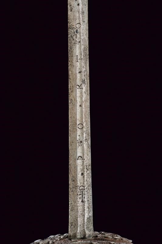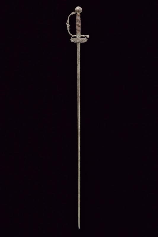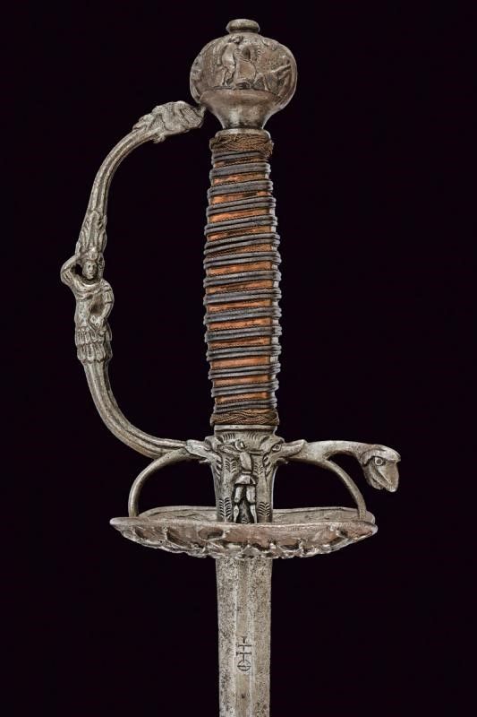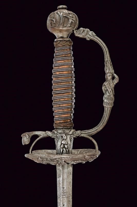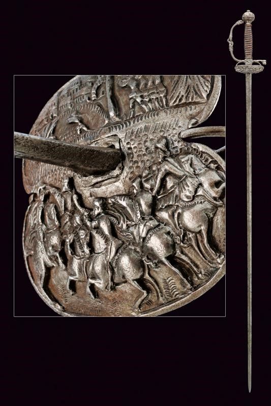 Paesi Bassi, lunghezza 108 cm. fine del XVII Sec. Lama dritta di sezione lenticolare, a due fili (qualche intaccatura), recante al forte un marchio su entrambe le facce e la dicitura P.O.R.T.O. all'interno dello sguscio. Fornimento in ferro. Coccia a due valve, lavorata in rilievo con una scena di assedio: in primo piano un gruppo di uomini d'arme a cavallo ben rilevati, al centro la raffigurazione stilizzata di truppe in formazione con picchieri, sullo sfondo gli edifici di una città e alcuni soldati vicino ad un accampamento. Il massello con un guerriero stilizzato, la guardia con una cariatide al centro lavorata a tuttotondo (in armatura all'antica); il pomo con truppe in marcia. Impugnatura con trecciola in ferro e teste di moro in rame.