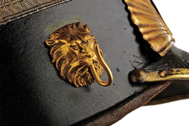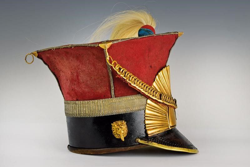 Francia, altezza 25 cm. 1830 - 1835 Fusto in robusto cuoio rivestito in panno color garanza; imperiale (presenza di piccoli buchi da tarme) di classica forma quadrangolare rivestito in panno garanza, agli angoli cordonature in gallone d'argento per un sottufficiale; turbante in robusto cuoio nero, visiera anch'essa in cuoio nero cerchiata in ottone; placca frontale in metallo dorato, ornamenti costituiti da leone e catenella; sotto gola in metallo dorato, presenza di coccarda tricolore e nappina con pennacchio bianco per trombettieri; all'interno alluda in pelle con cuffia in cotone nero.