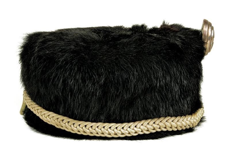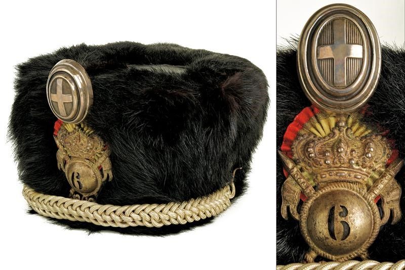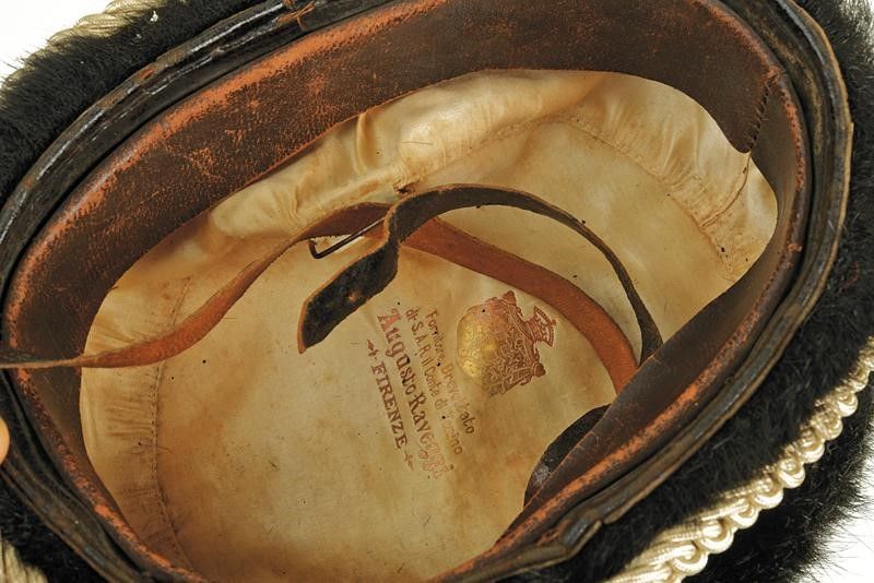 Regno d'Italia, altezza 11.5 cm. Fine del XIX Secolo In pelliccia nera con imperiale in cuoio, cordellina intrecciata, fregio coronato e traforato con lance e sotto corona, coccarda tricolore, nappina in argento; all'interno ampio marocchino e fodera in seta bianca con timbro del fornitore Augusto Raveggi Firenze. Soggolo. Raro.