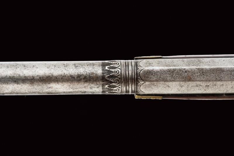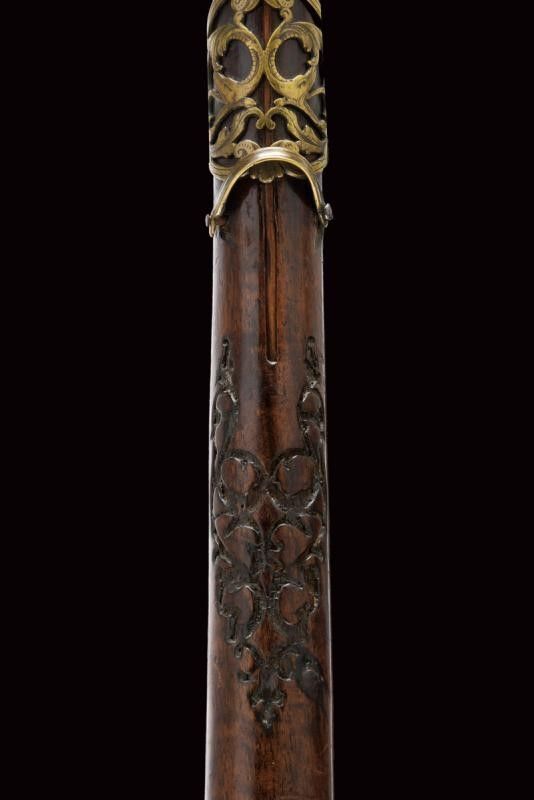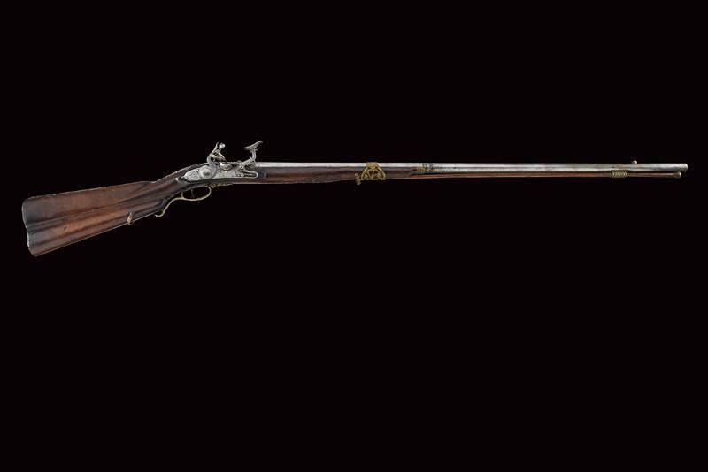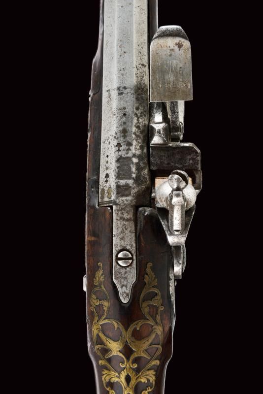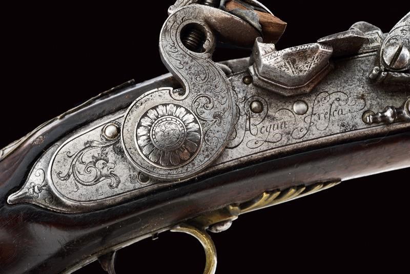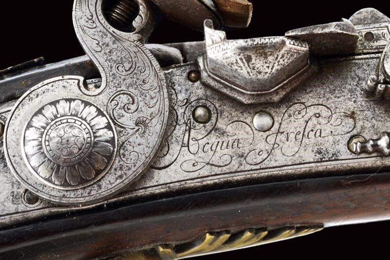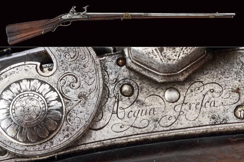 XVIII Secolo Canna liscia a due ordini, ottagonale e tonda, con resti di punzoni alla culatta (intaccature), anellature e cornicetta al cambio, mirino in ottone; in volata cal. 17,4 mm. Batteria a cartella piatta con codetta recante incisione a grottesca, al centro la firma Acqua Fresca, il vitone del cane con bel decoro a fiore, inciso anche il collo della martellina. Meccanica funzionante. Mezza cassa in legno con fornimenti in ottone (due placche mancanti). La contropiastra incisa e intagliata con effige di serpente a fauci spalancate, altri serpenti al fornimento dorsale (con piccola mancanza), il bel reggicanna, messo a giorno, ne riprende lo stesso disegno. Bacchetta in legno con cavastracci in ferro e battipalla in corno.