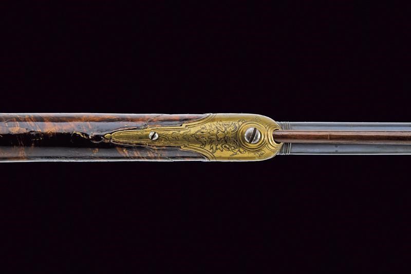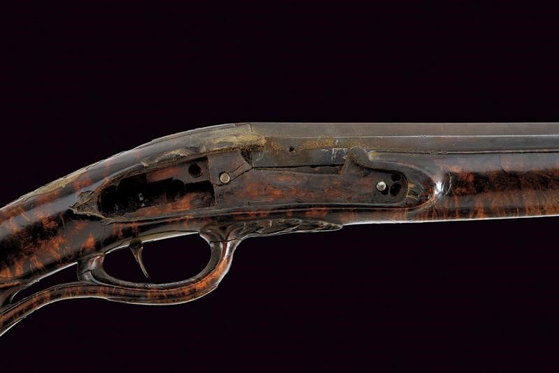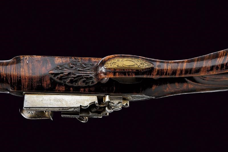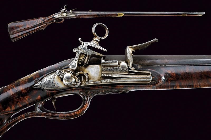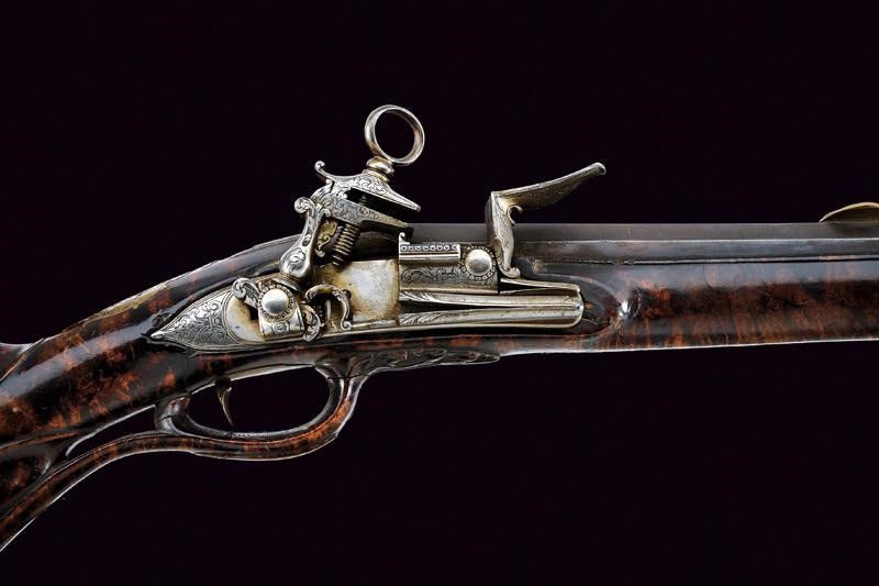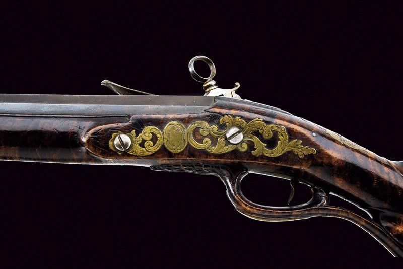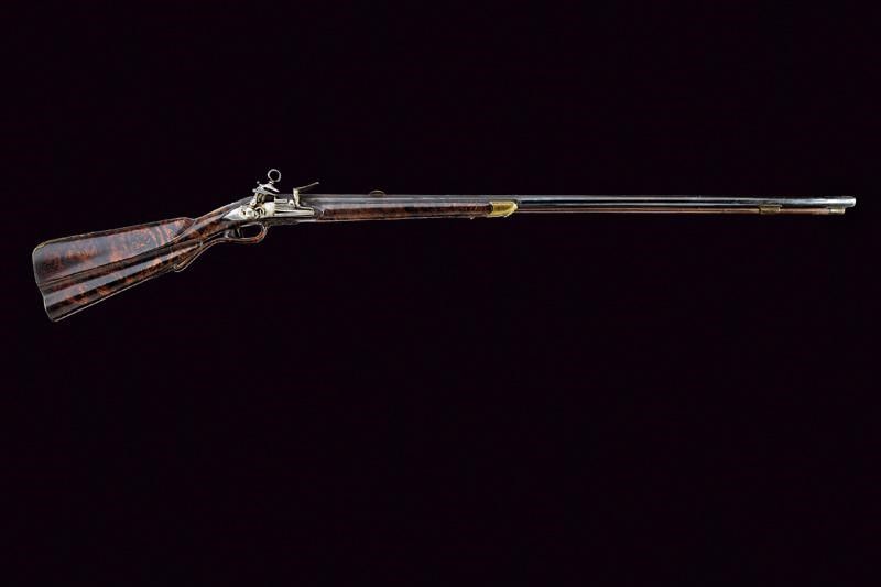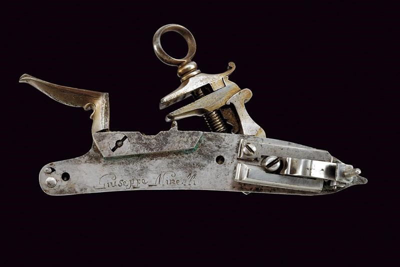 Prima metà del XVIII Secolo Canna liscia a due ordini, ottagonale e tonda, recante alla base una marca rimessa in ottone con iscrizione LOIOLA, mirino argentato su base a coda di rondine, alzo fisso in ottone, la finitura brunita (brunitura antica?), in volata cal. 16,5 mm. Elegante batteria a pietra focaia con cartella leggermente tondeggiate incisa alla codetta a motivi floreali coś come al collo, sulle ganasce, e allo scodellino. Il retro della piastra con firma Giuseppe Minelli. Mezza cassa in radica con pala sgusciata, l'astina con crepa verso il bocchino, il ponticello alla cappuccina, qualche piccola crepa e riparazione. Fornimenti in ottone. Calciolo con trofeo d'armi e cornici incise. Al dorso un emblema nobiliare coronato, tenuto da cariatidi e sormontato da mascherone. Il bocchino finemente inciso con mascheroni e grottesche. La contropiastra lavorata anche a traforo. Bacchetta in legno con base per cavastracci in ferro e battipalla in ottone.