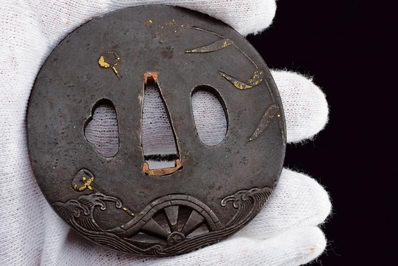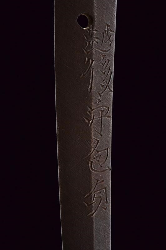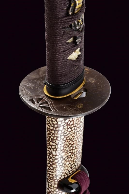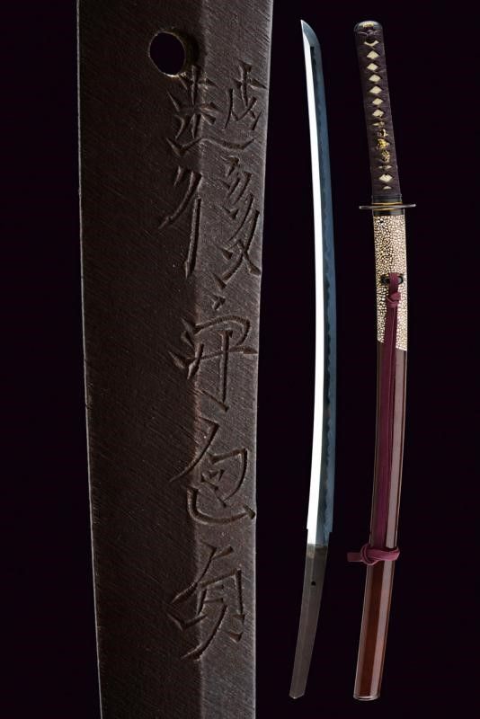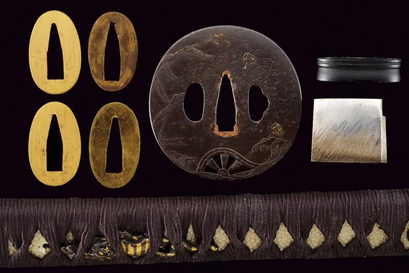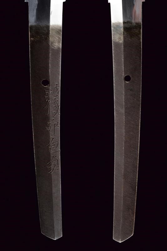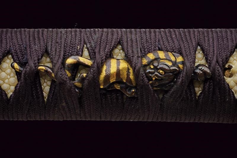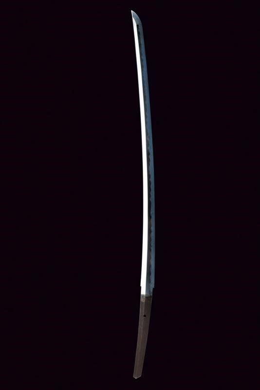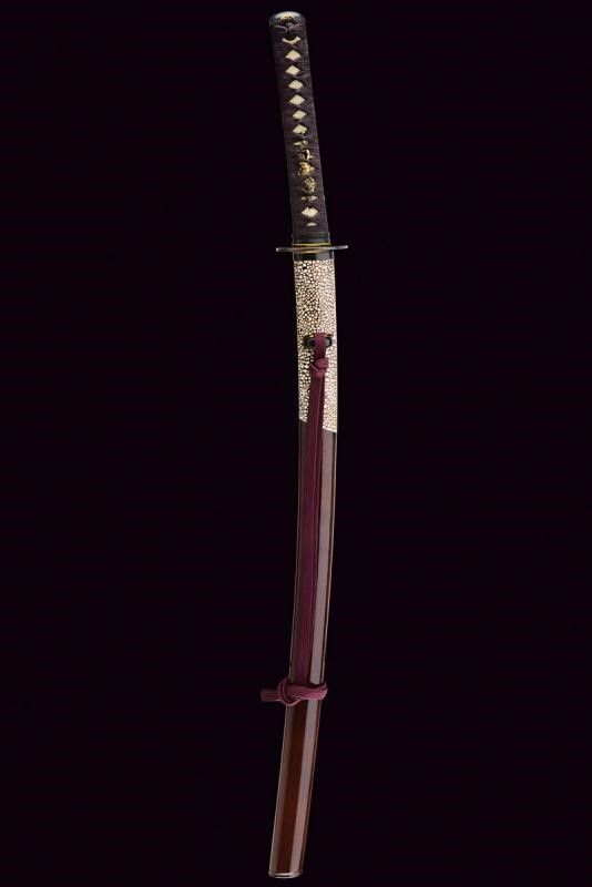 Giappone, lunghezza 96,5 cm. Periodo Edo (1603-1867) Lama Shinogi-zukuri, Iori-mune. Nagasa: 69,6 cm. Hamon e hada ben visibili. Nakago-jiri: Iriyamagata. Mei: Echigo no Kami Kanesada. Un Mekugi-ana. Epoca Shinto, XVII Secolo. Habaki in argento. In koshirae con Tsuba in ferro Maru-gata d'epoca Edo intagliata, parzialmente traforata e con resti di doratura. Fuchi e Kashira in ferro (più tardi?), grandi Menuki antichi ben lavorati a effigiare Tora. Same e Tsuka-ito successive. Anche il fodero più recente con bella lacca rossa decorata a tarsie color bianco nella parte superiore.