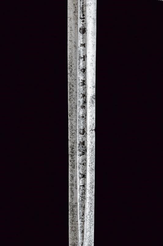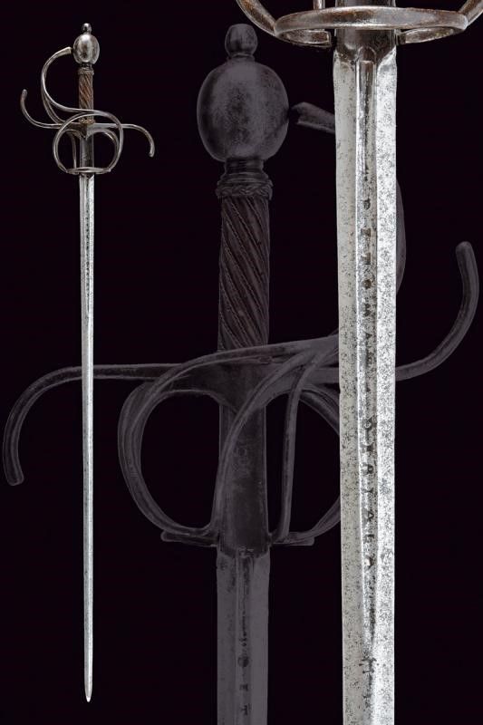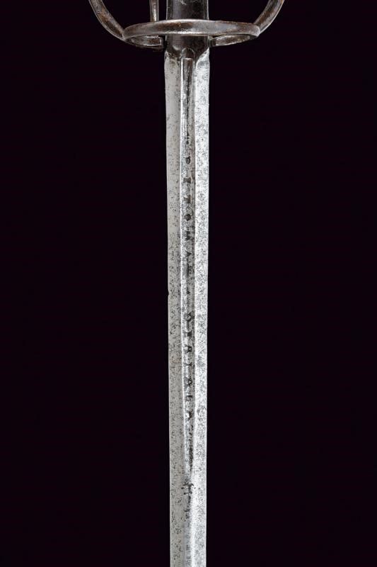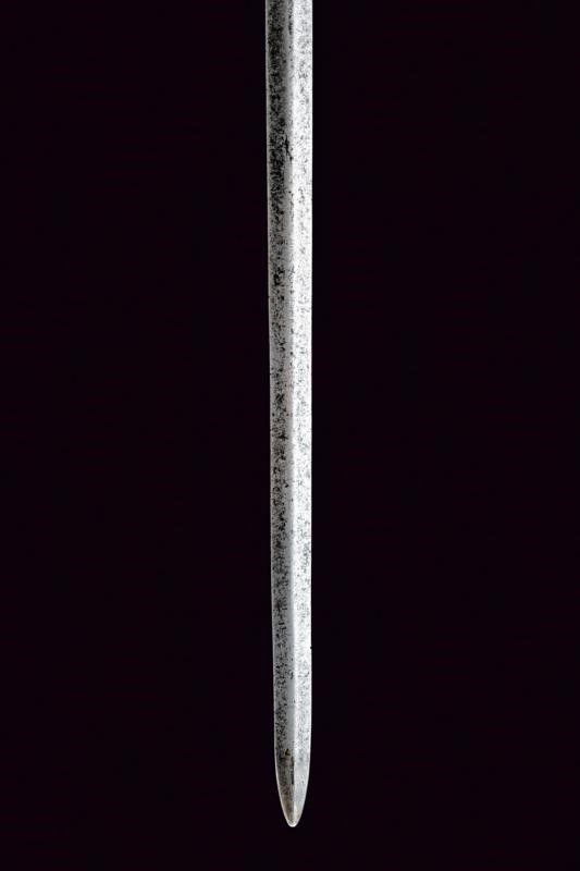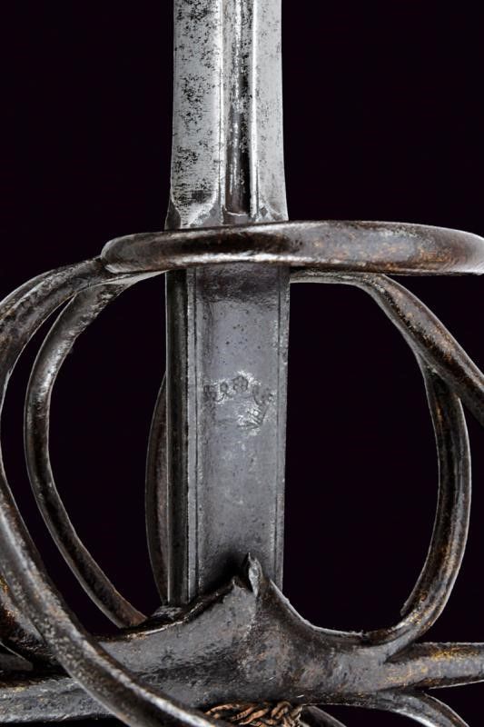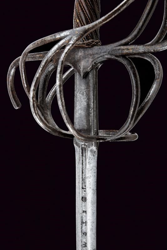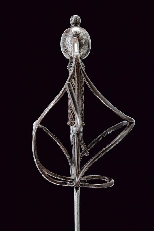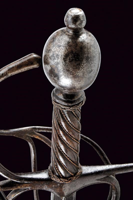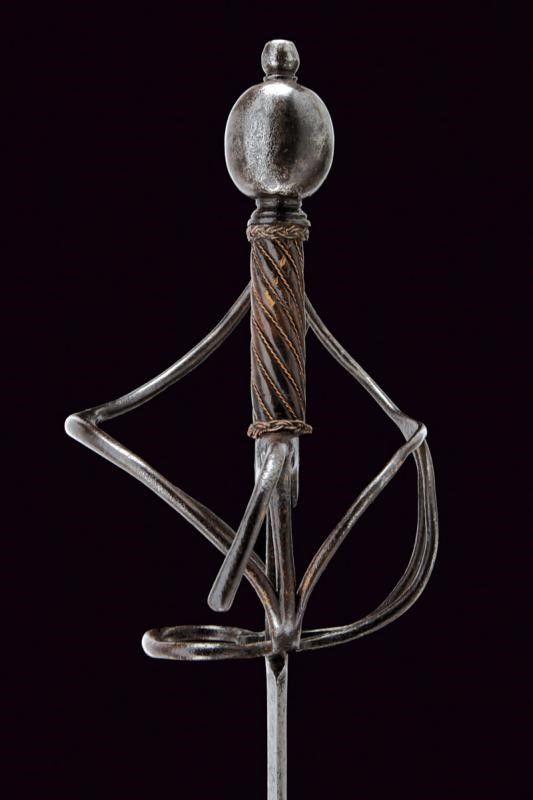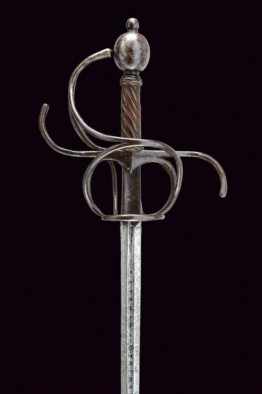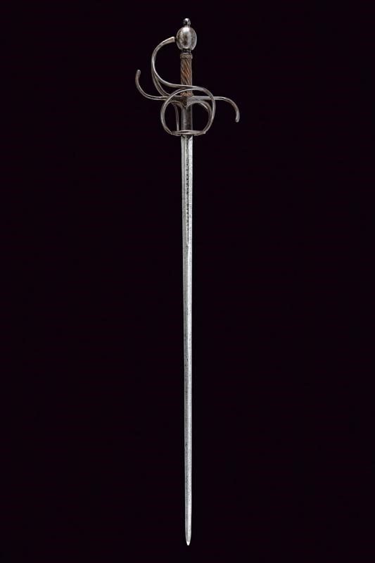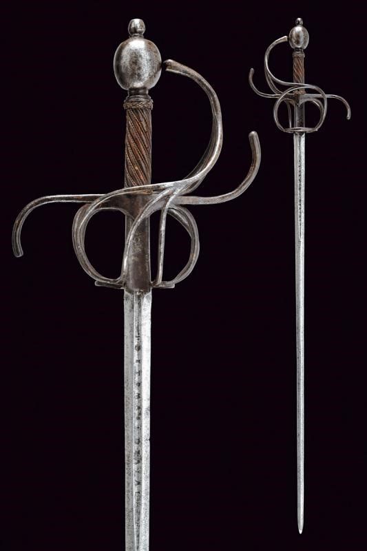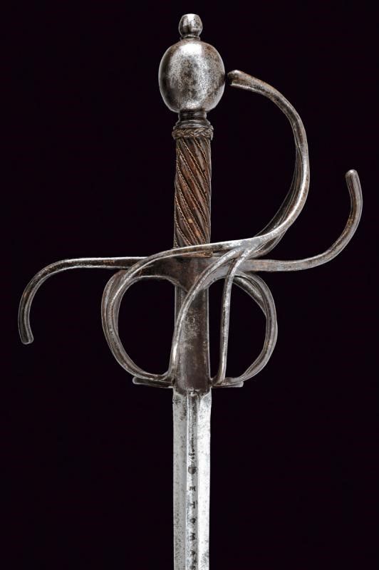 Italia settentrionale, lunghezza 118 cm. 1600 circa Lama dritta a due fili; la prima parte scanalata in mezzeria recante la firma DE TOMAS DE AIALA. Lungo ricasso con marca a forma di corona. Fornimento tipico dell'epoca con ponticello, elso con bracci a S, guardia a tre rami e protezione posteriore. Pomo ovale. Impugnatura in legno scolpito a spire con trecciola e teste di moro in filo di rame.