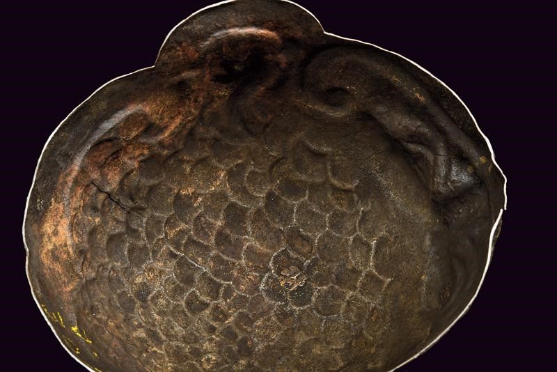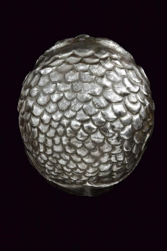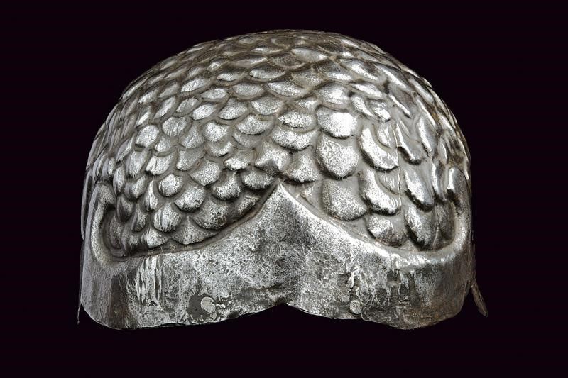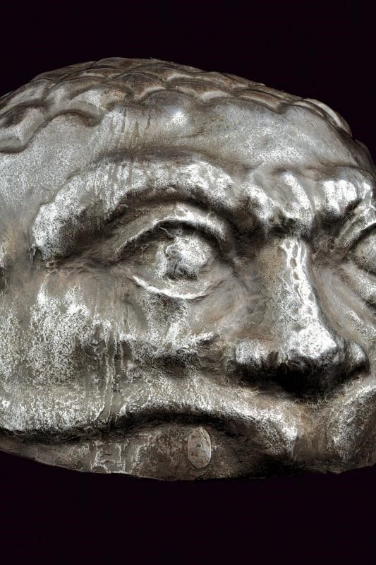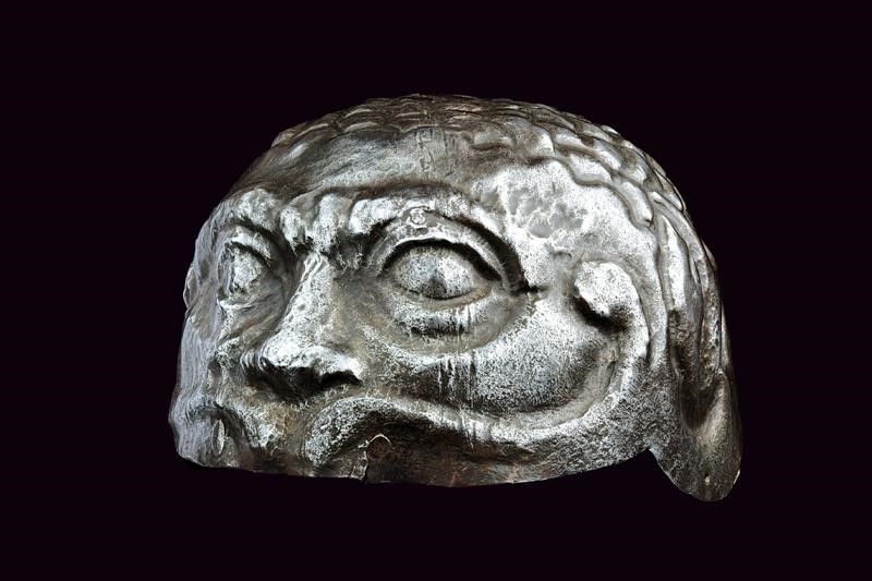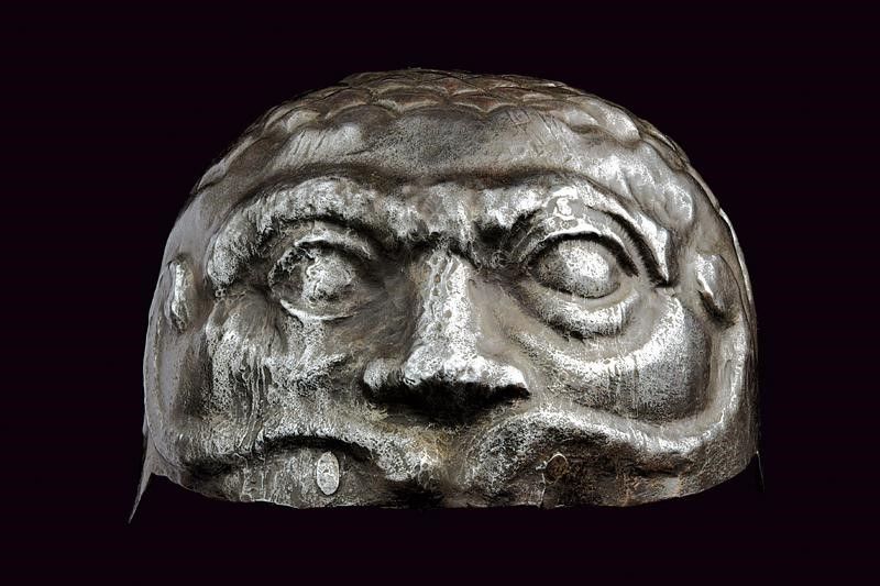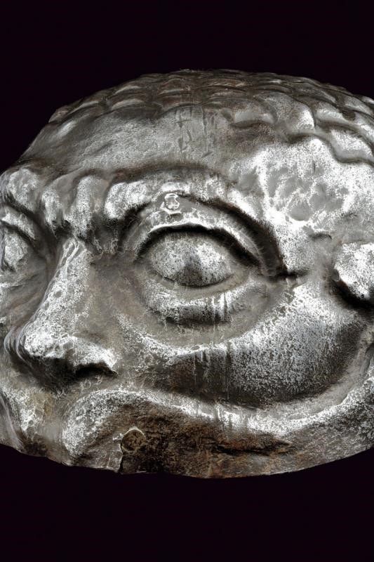 Italia, altezza 13,5 cm. 1600 circa Calotta in ferro lavorata in un solo pezzo, la parte anteriore mostra un volto con occhi, sopracciglia, naso ben pronunciato e larghi moustacchi, il tutto in rilievo. La parte superiore a fingere i capelli. Resti di doratura sulla superficie, resti di rivetti nella parte posteriore. Molto interessante.