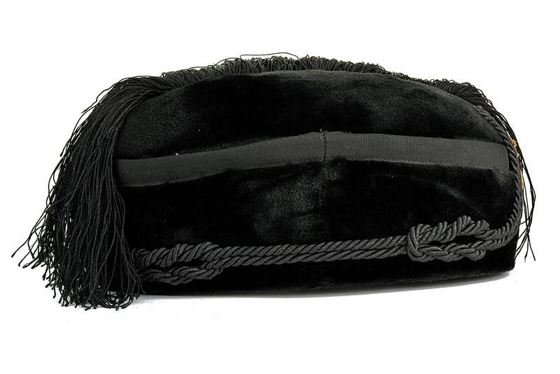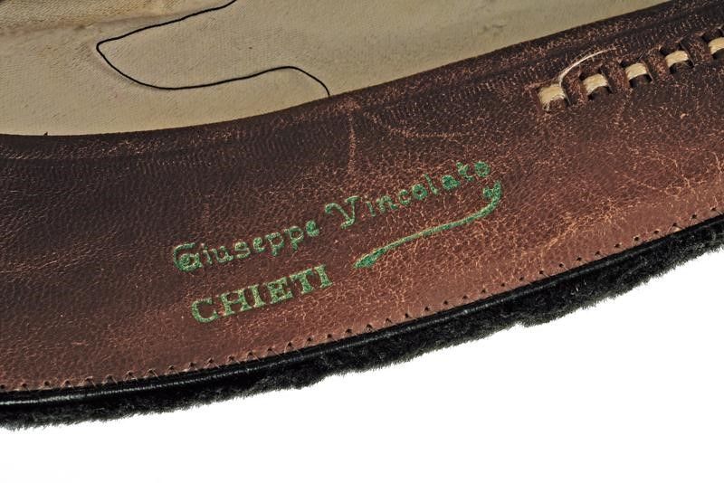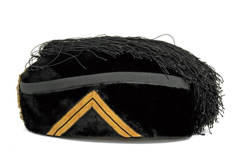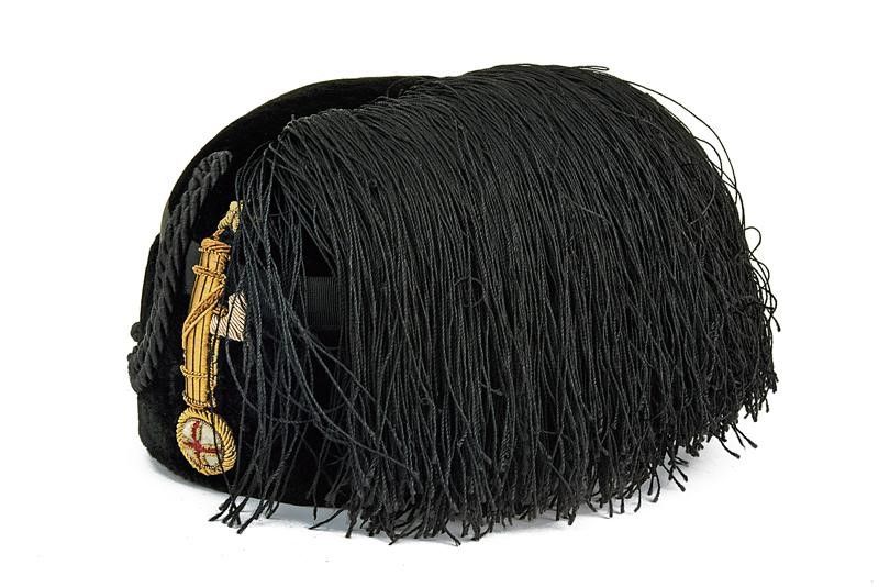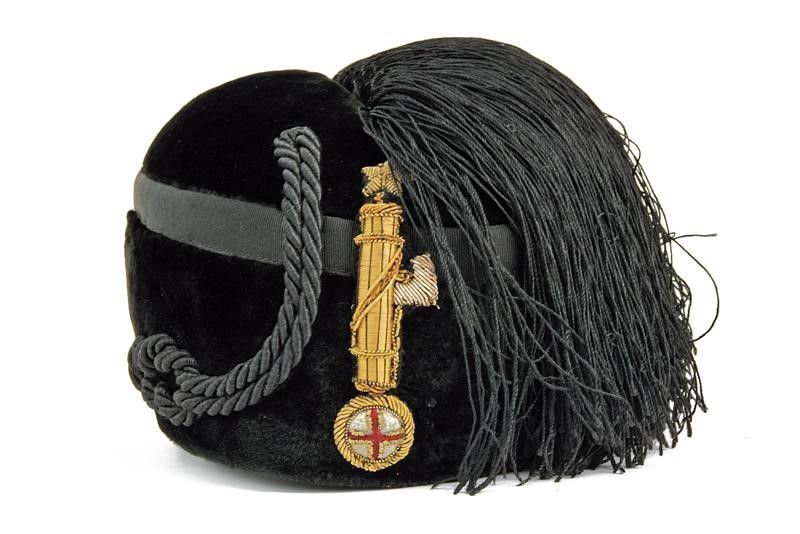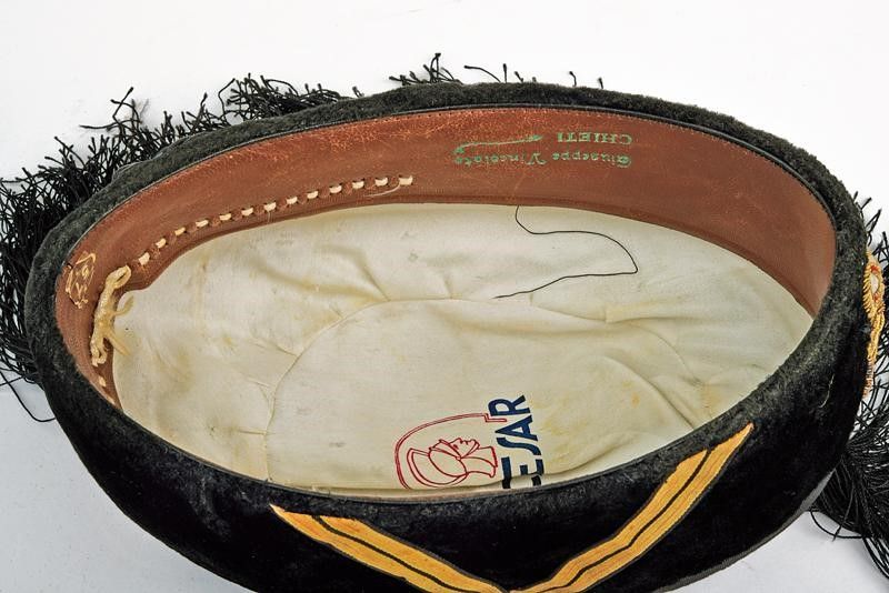 Regno d'Italia, altezza 11.5 cm. 1940 circa Corpo rivestito di velluto di seta nero con frange e cordatura neri, fregio anteriore della specialità in canutiglia dorata e argentata. All'interno alluda in pelle marcata Giuseppe Vincolato CHIETI, la cuffia con marca del fabbricante CAESAR, taglia 57.