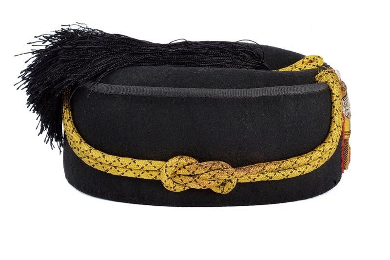Italia, altezza circa 10 cm. XX Sec. In panno nero. Con fregio anteriore in canutiglia oro e argento su panno rosso, il numero della legione in metallo dorato. Cordino e gallone in canutiglia dorata. Completo di frange. Alluda interna ben conservata, fodera in seta con qualche segno d'uso e del tempo e lieve sfilacciatura. Il marchio della ditta non più leggibile.
