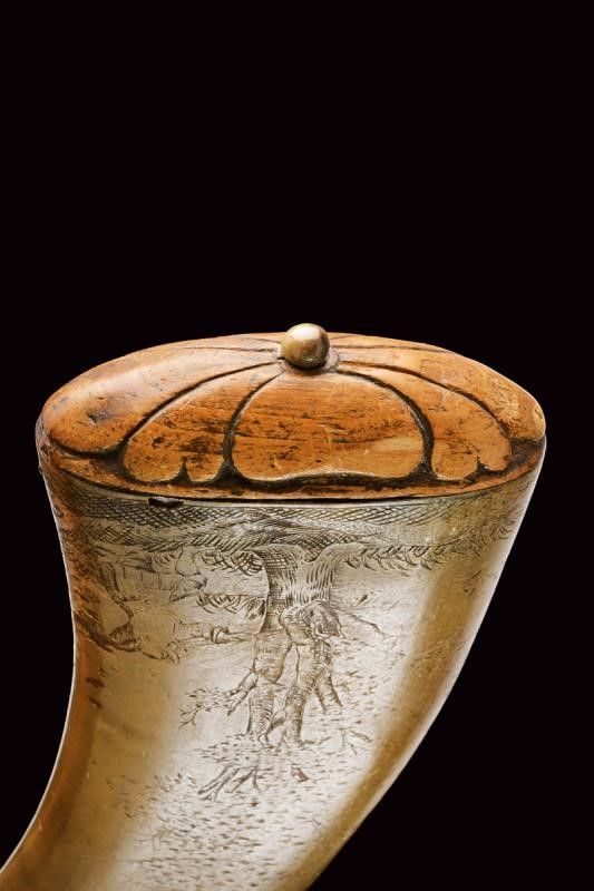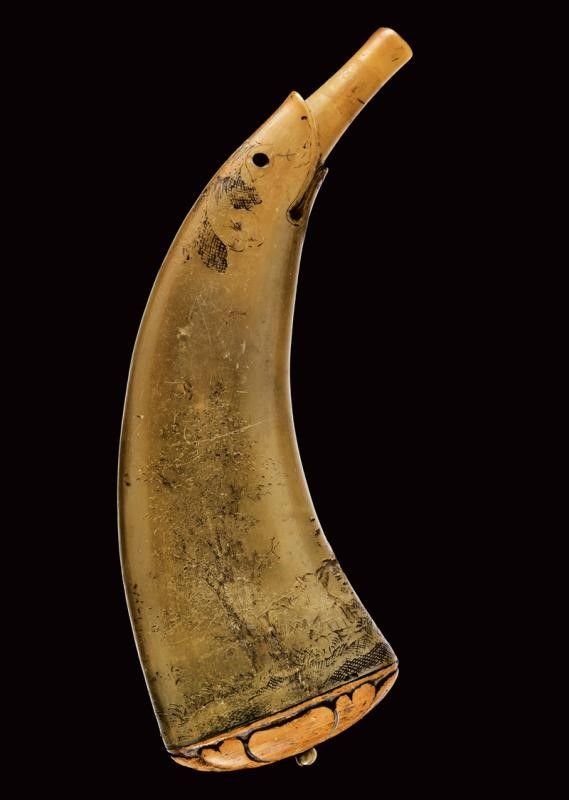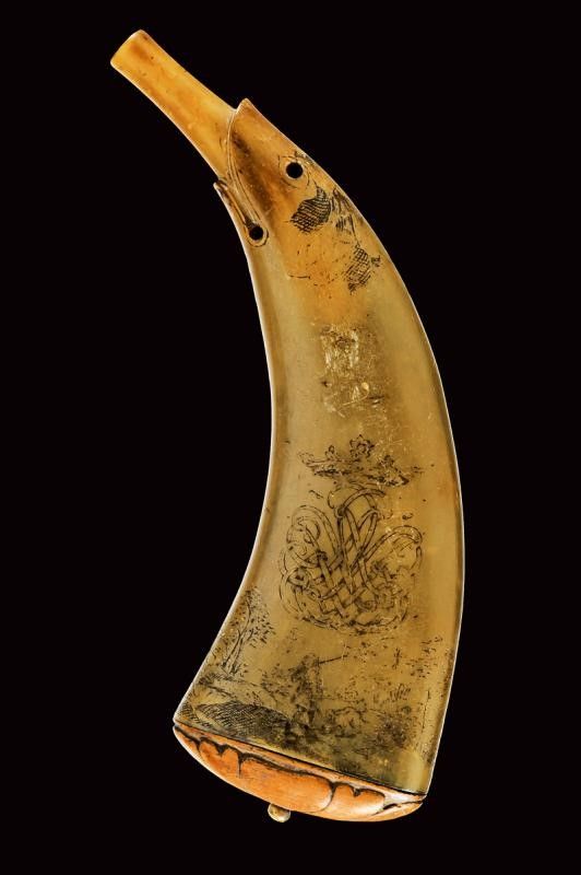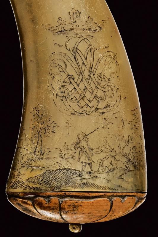 Olanda, lunghezza 23 cm. 1700 circa In corno di mucca pressato, lavorata in un solo pezzo con il cannello a forma di testa di pesce. La base chiusa con placca in legno scolpito a motivi floreali. Su un lato, finemente inciso un monogramma speculare sormontato da corona a cinque punte, sopra un cacciatore a piedi con il suo segugio, il fucile a pietra sopra la sua spalla; sul lato opposto il cacciatore mira a due anatre in un lago. Di buona qualitą.