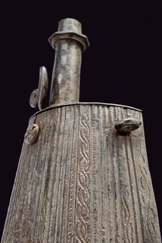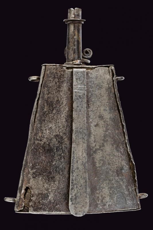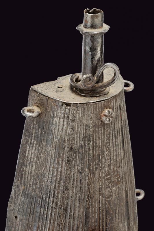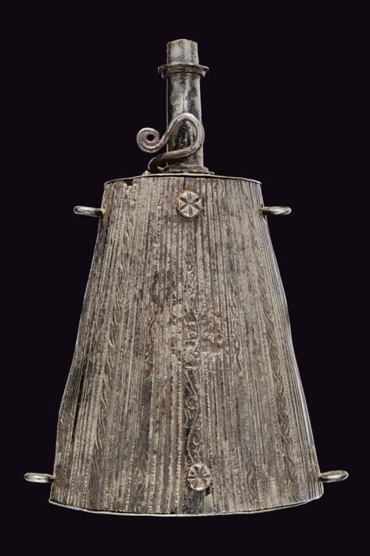 Brescia, altezza 16,5 cm. 1600 circa In ferro. Con serbatoio di forma quasi troncoconica, piatto sul retro e fortemente convesso sul lato anteriore la cui superficie è anche ornata a scanalature longitudinali e con resti di cornicette a volute e racemi. Quattro campanelle di sospensione. Il cannello cilindrico, con anellature e con chiusura dotata di molla ancora funzionante. Sul retro il gancio da cintura.