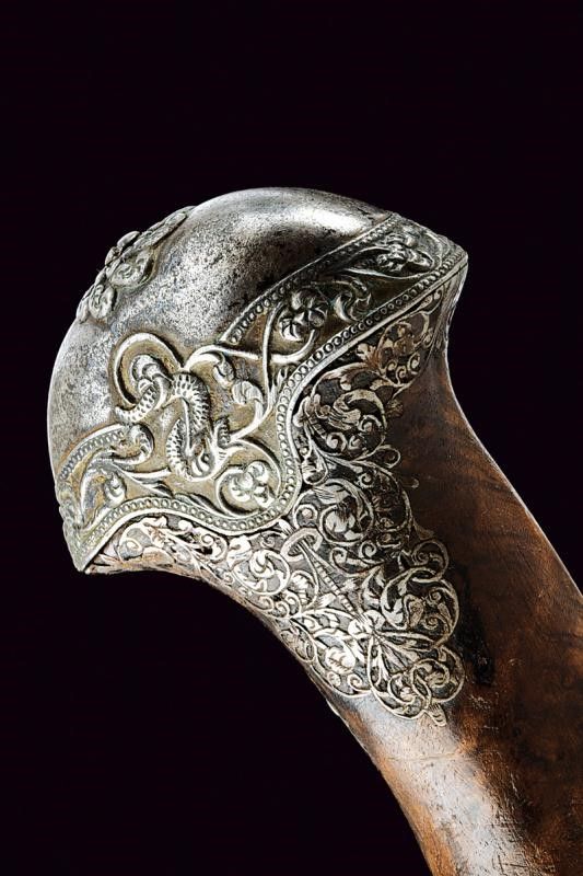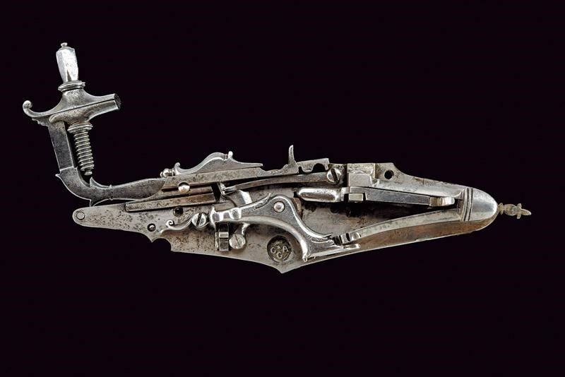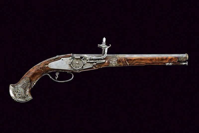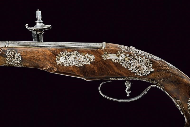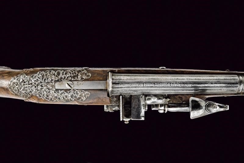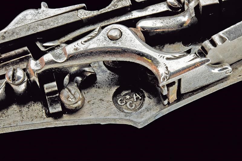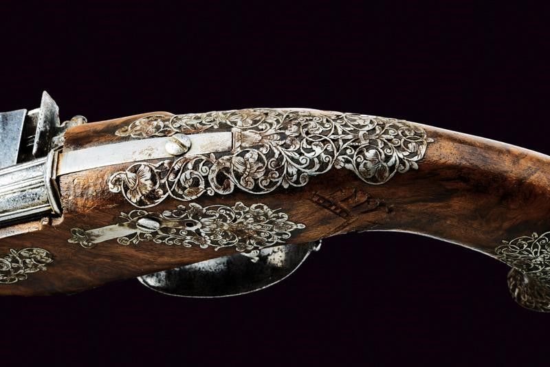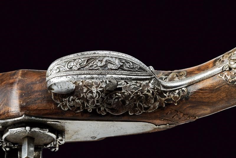 metà del XVII Sec. Canna liscia a due ordini dotata di cornice modanata in culatta, e di gioia di bocca in volata; il primo segmento ottagonale, recante al dorso la marcatura LAZARINO COMINAZZO e nervature longitudinali agli angoli, il secondo segmento a faccettature longitudinali. In volata cal. 12,5 cmm. Batteria a ruota esterna intagliata a foglie; il collo del cane angolato con base a balaustro culminante in un bocciolo dal quale si protrude la seconda parte del collo, anche le ganasce di lavoro ben rifinite. All'interno della cartella il marchio G A con stella a sei punte e corona a sormontare il tutto, in basso un'altra G. La meccanica con alcuni componenti leggermente intagliati. Cassa intera in radica, in buono stato di conservazione senza crepe strutturali, forse l'astina con restauro. Fornimenti in ferro con decori di qualità. Lo scudetto dorsale tutto lavorato al traforo con una fitta trama di racemi e boccioli come anche le placche dell'impugnatura e i due elementi di contropiastra (mancante il gancio da cintura) con eleganti racemi e fiori. La coccia a fungo di forma schiacciata sui fianchi con cornice in rilievo a grottesche di serpenti intrecciati con fiori, al culmine una rosetta sempre in rilievo. Il ponticello con banda intagliata en suite con la coccia. Il grilletto finemente lavorato a pesce. Il reggibacchetta riprende il medesimo decoro degli altri elementi. La bacchetta, probabilmente antica, con bel battipalla tornito e cavastracci in ferro. Pistola elegante nella tipica alta qualità dei maestri bresciani.