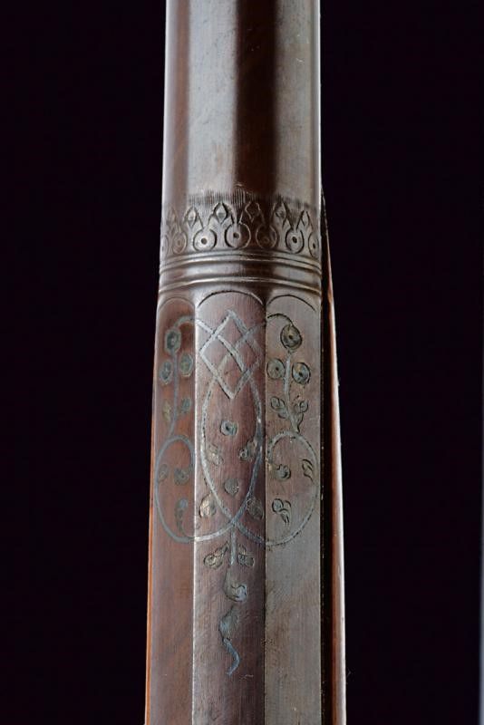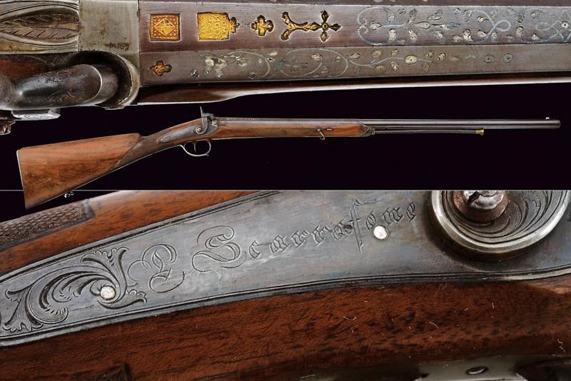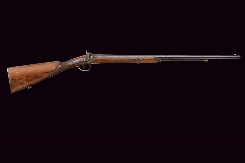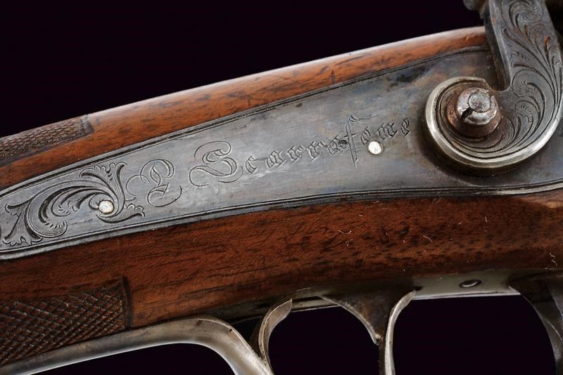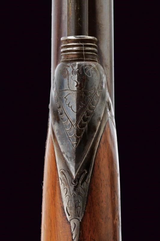 Napoli, lunghezza cm. Metà del XIX Secolo Canna liscia a due ordini di produzione spagnola d'inizio XIX sec. La prima parte ottogonale con marchi di DOMINGO MAS SAV rimessi in oro tra gigli e croce, le estremità decorate in argento (piccole mancanze) a motivi floreali; la seconda parte tonda con anellature al cambio e con incisioni geometriche; il mirino in argento, a coda di rondine, la volata cal. 18 mm. Lunga codetta incisa e munita di traguardo. Batteria a molla indietro firmata P. Scarrofone ed incisa a motivi floreali. Mezza cassa in legno con collo e astina zigrinati. Fornimenti in ferro decorati en suite. Bacchetta in corno (piccole mancanze) con fornimenti in metallo.