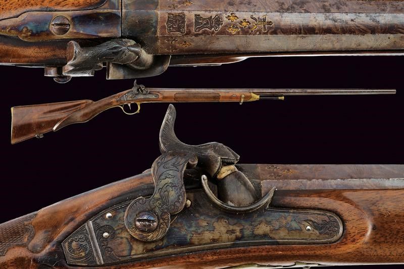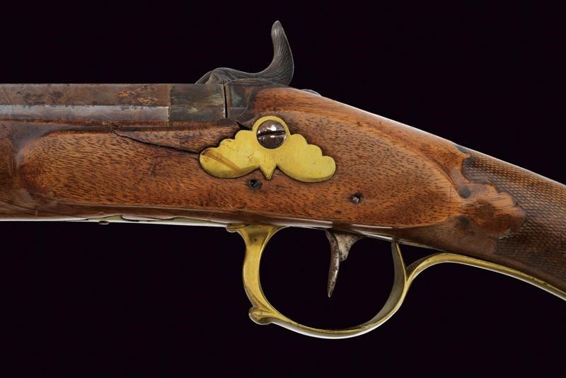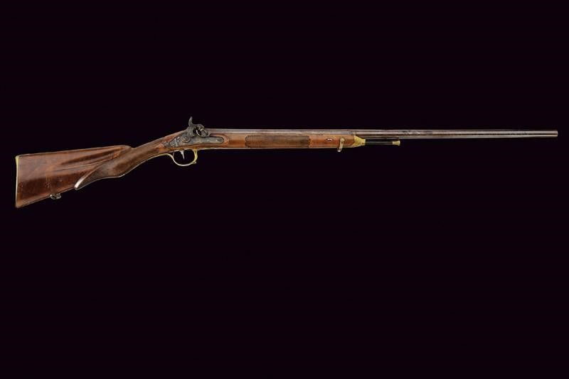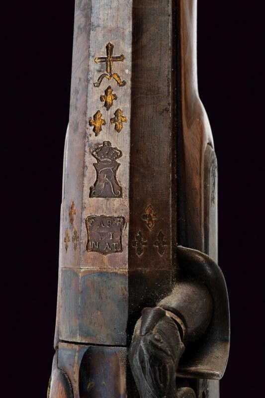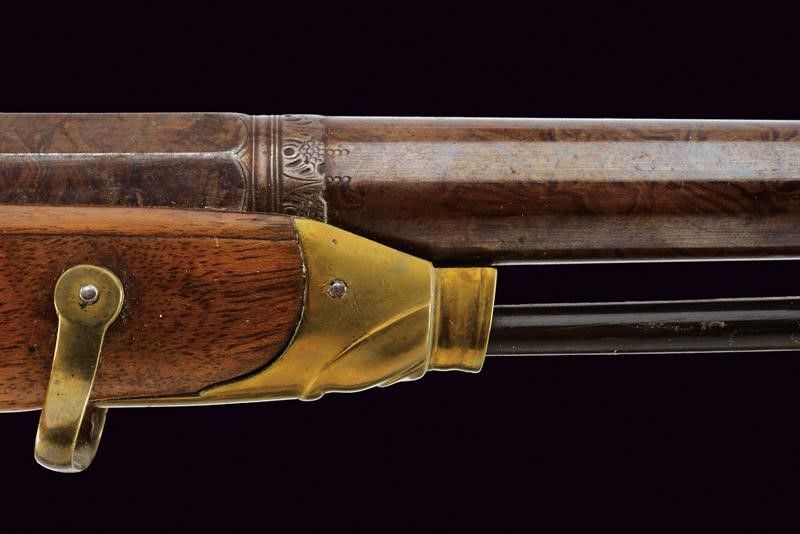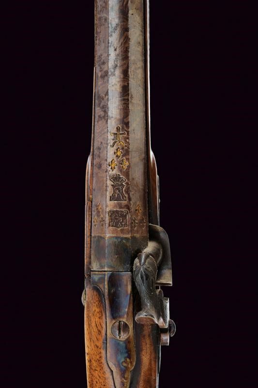 Metà del XIX Secolo Bella canna liscia a due ordini; la prima parte ottagonale con punzoni della Real Fabbrica di Napoli, gigli e una croce, la seconda parte tonda con un'anello e foglie d'acanto al cambio, mirino mancante. Bella brunitura damascata su tutta la lunghezza, cal. 17 mm. Codetta con traguardo. Batteria a molla in avanti, tartarugata, ed incisa con volatile, serpente e a motivi floreali. Meccanica funzionante. Mezza cassa in legno (piccole mancanze e restauri) con astina e collo zigrinati, la pala scolpita. Fornimenti lisci in ottone. Bacchetta in corno (piccole mancanze) con fornimenti in metallo.