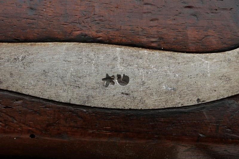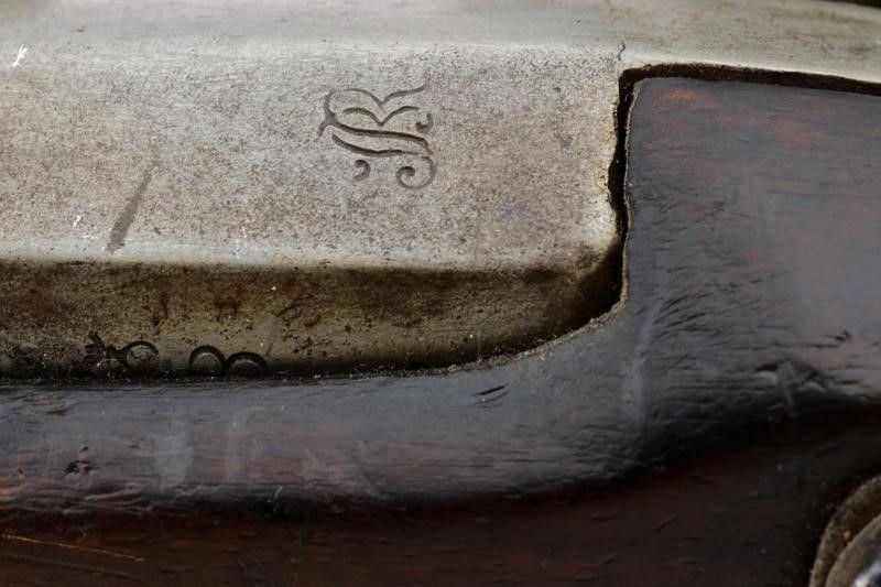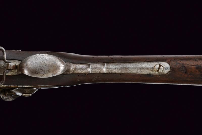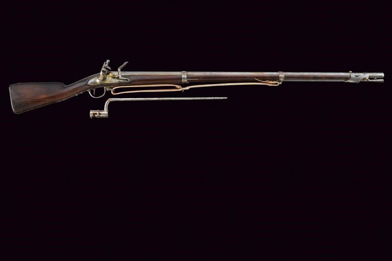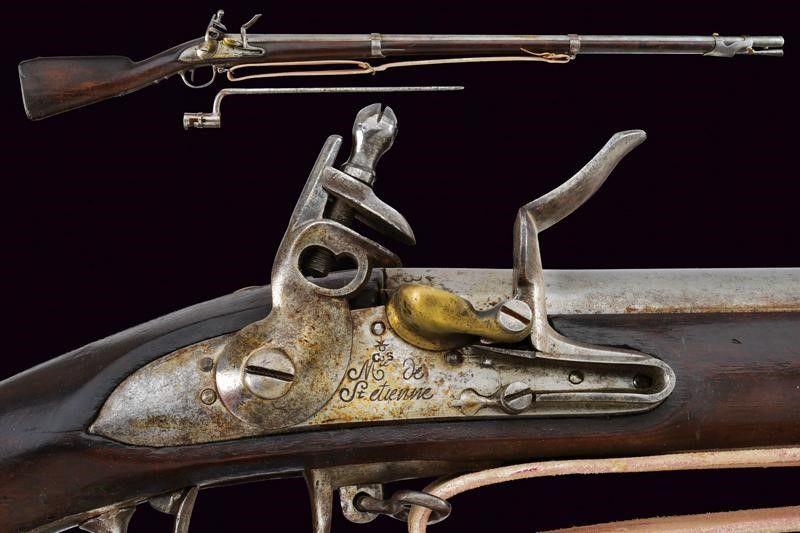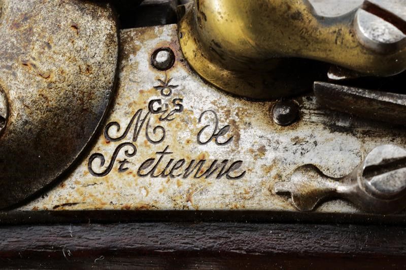 Inizio del XIX Secolo Canna tonda liscia con culatta ottagonale, recante resti di marchi non chiaramente leggibili (forse una B sormontata da giglio), munita di dente d'innesto per baionetta, cal. 17,8 mm. in volata. Batteria con scodellino in ottone, cartella marcata M. de St. Etienne, punzonata con granata fiammeggiante e CS. Meccanica funzionante (al secondo scatto il cane non sta in monta). Cassa intera in legno con restauri e fori di tarlo soprattutto alla pala, recante marchio EB accanto alla contropiastra e una B sulla pala. Fornimenti in ferro. Bocchino con vite a galletto in ottone. Vari punzoni G sotto stella. Bacchetta in ferro. Con una baionetta a ghiera.