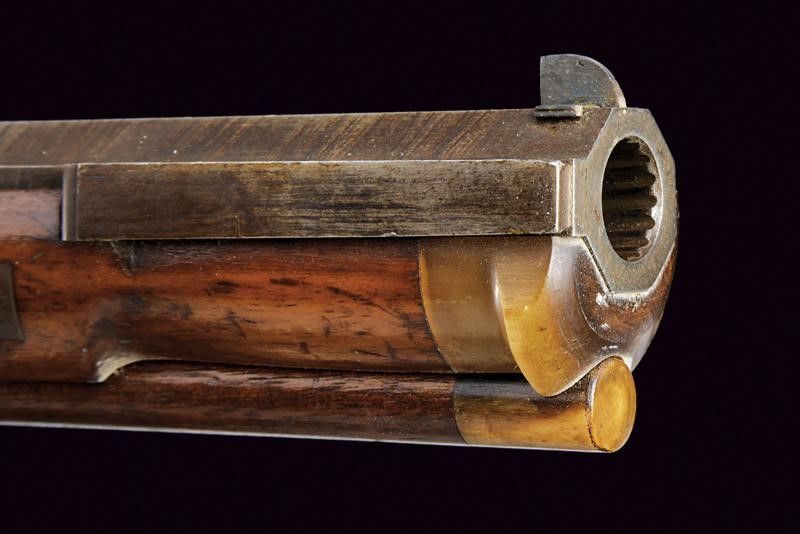 1850 circa Pesante canna rigata ottagonale (anima pulita, leggero pitting, rigatura ben visibile), a torcione, munita di alzo regolabile, mirino e attacco per la baionetta, cal. 16 mm; codetta munita di diottra pieghevole. Batteria a luminello a molla in avanti con cartella piatta, resti di brunitura, firmata L. C. Perrenoud A LA SAGNE. Cassa intera in legno di noce con astina e collo microzigrinati. Fornimenti in ferro, ponticello anatomico, grilletto e stecher. Completo di bacchetta in legno con battipalla in corno e cavastracci in ferro; sul dorso uno scudetto ottagonale in argento con monogramma. Meccanica funzionante.