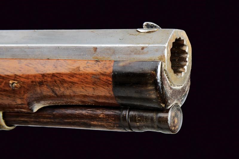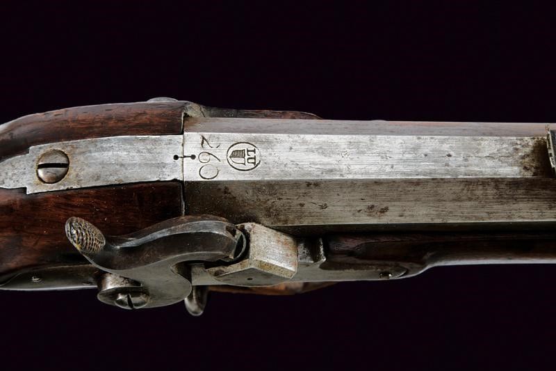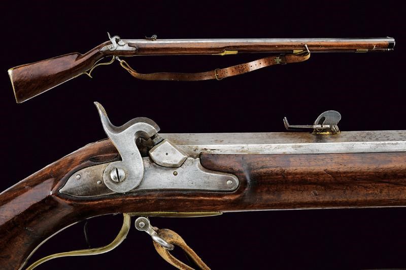 secondo quarto del XIX Sec. Massiccia canna rigata (anima pulita, con leggero pitting, rigatura ben visibile), marcata alla base con lo stemma di Lucerna e il numero 260, munita di alzo regolabile e mirino, cal. 16 mm; codetta liscia. Batteria ridotta a luminello, piatta, con coda tondeggiante. Cassa intera in legno con fornimenti in ottone, bacchetta in legno con battipalla in corno scolpito. Completa di cinghia in cuoio con croce in metallo bianco marcata LUZERN 1928 e con croce elvetica.