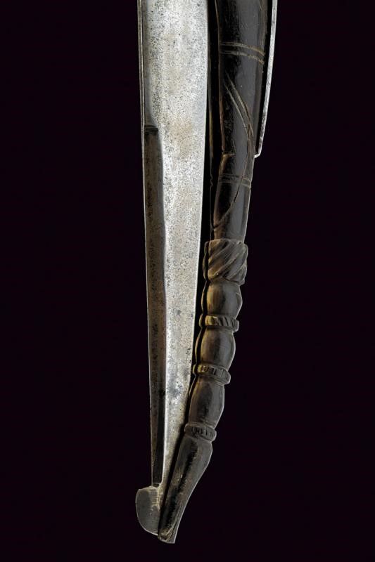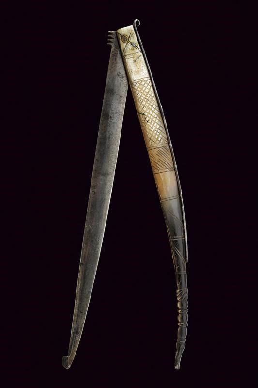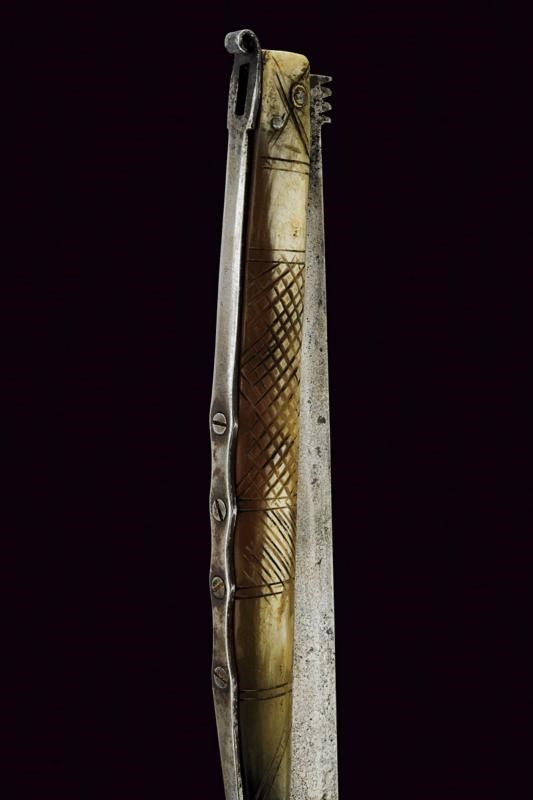 Stato Pontificio, lunghezza open 67,5 cm. Terzo quarto del XIX Secolo Lama dritta a un filo, il taglio lievemente convesso, con punta arrotondata a lenticchia. Qualche intaccatura. La molla dorsale in ferro con profilo cuspidato al centro. Impugnatura in corno di vacca, di forma leggermente incurvata, intagliata a motivi geometrici e con un segmento zigrinato al centro. La parte terminale (piccola crepa su un lato) riccamente intagliata a balaustro. Raro.