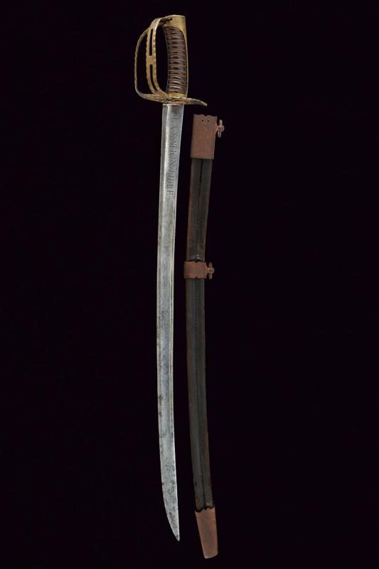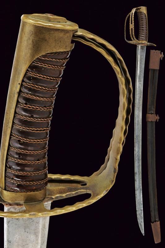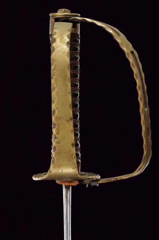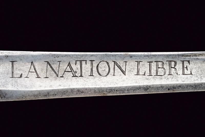 Fine XVIII inizio XIX Secolo Lama quasi dritta a un filo e breve controfilo, sgusciata per quasi tutta la lunghezza e munita di sottile scanalatura accanto al dorso nel segmento centrale, recante sul lato di terza il motto LA NATION LIBRE. Fornimento in ottone con guardia traforata e recante decoro ondulato ai bordi. Una seconda guardia è incardinata sulla prima, munita di fermo a molla in ferro per bloccarla. Cappetta lunga liscia. Impugnatura con rivestimento in manica di cuoio (qualche foro di tarlo) e con avvolgimento di trecciole in rame. Il fodero in cuoio, antico e molto consumato, parzialmente scucito, con fornimenti in ferro (in patina, una fascetta lasca) a due campanelle.