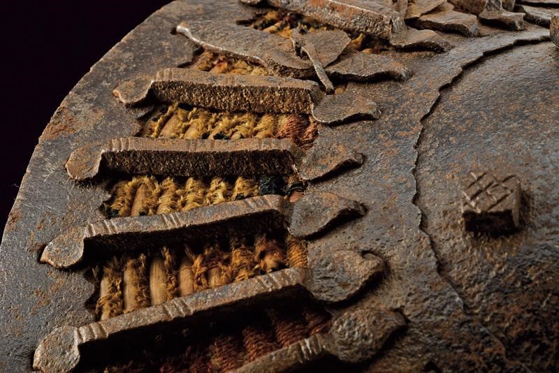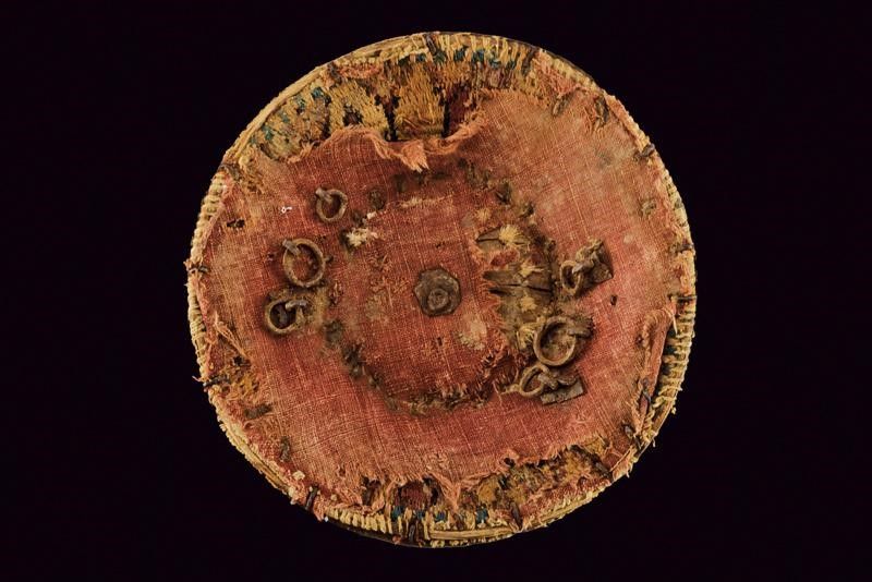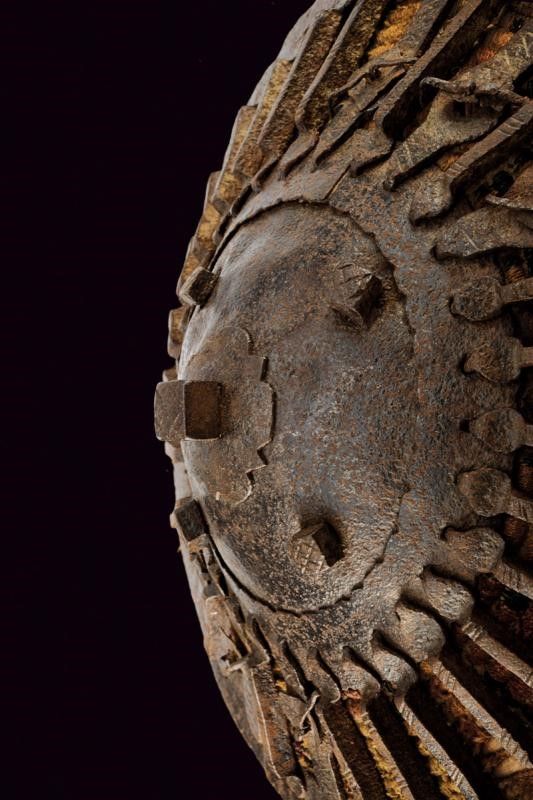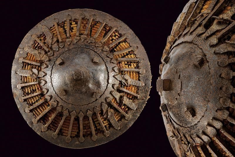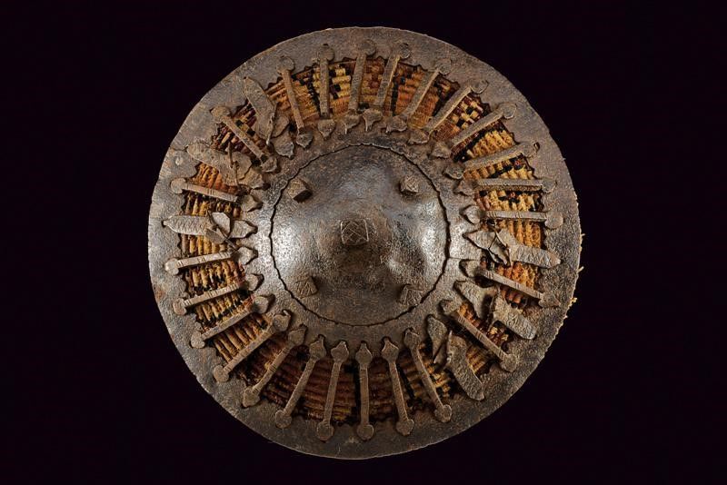 Turchia, diametro 27.5 cm. fine del XVIII Sec. Di forma conica; con umbone in ferro dotato di cinque borchie a testa quadra e bordato con una ghiera dalla quale partono una serie di barre in ferro a raggiera che si congiungono con il bordo, anche questo in ferro. La superficie sottostante in legno rivestito di tessuto policromo. L'interno in legno, anche questo parzialmente foderato in tessuto e munito di sei anelli in ferro per le maniglie. Difetti e mancanze. Raro.