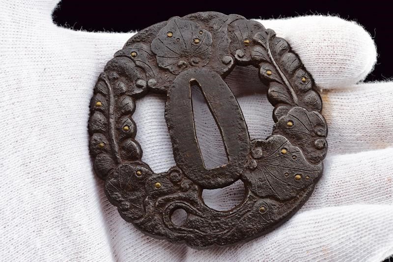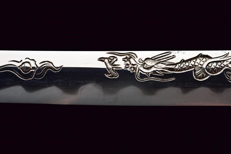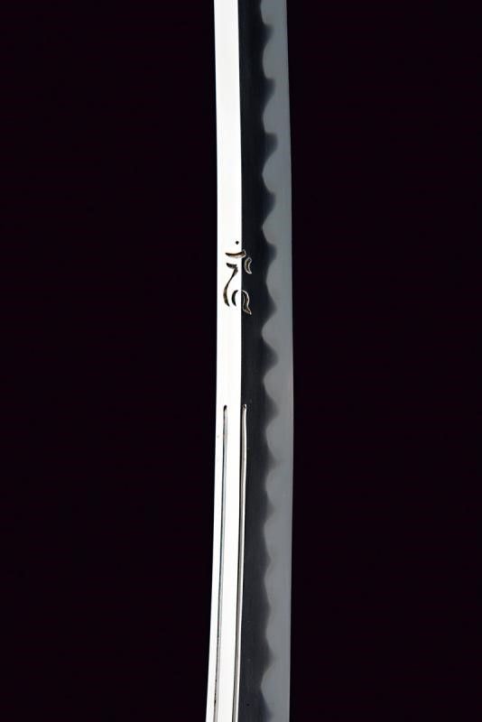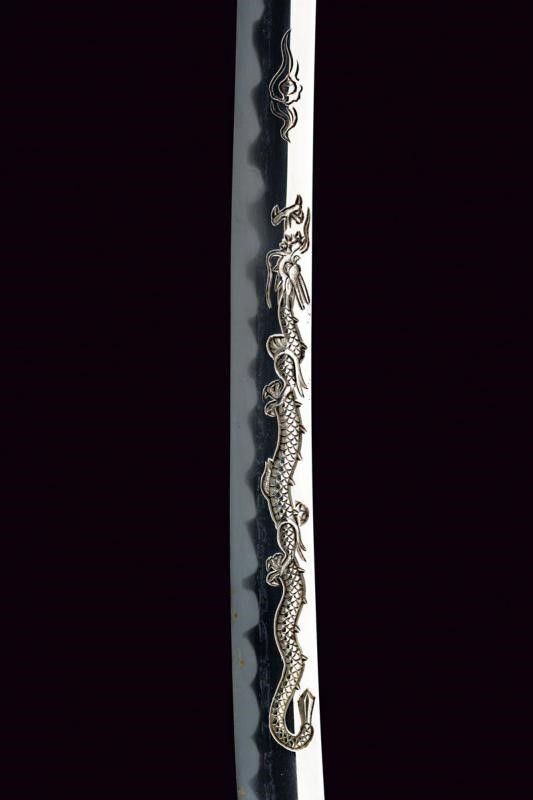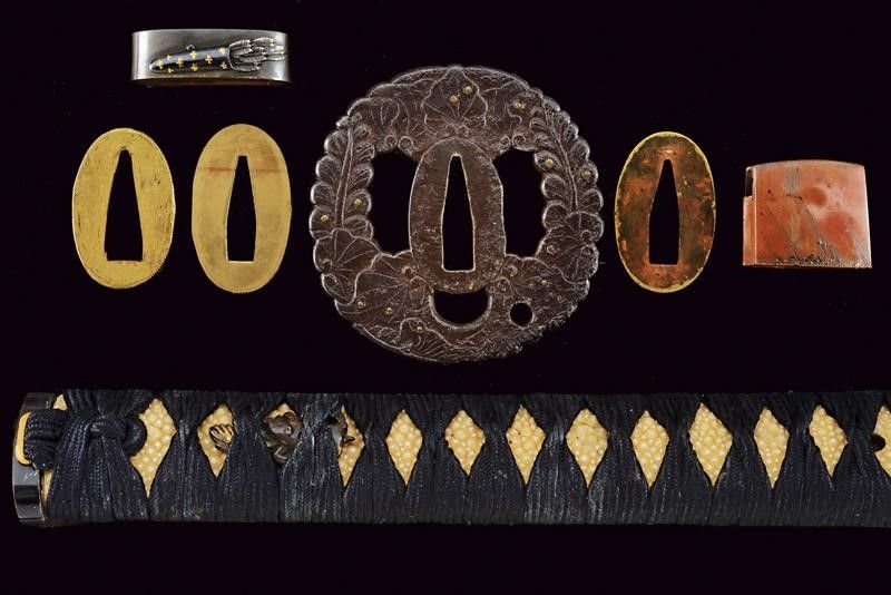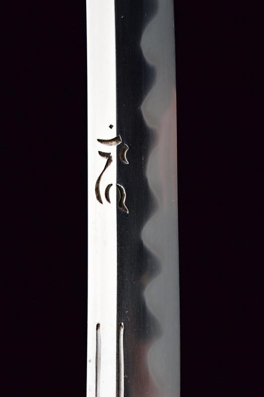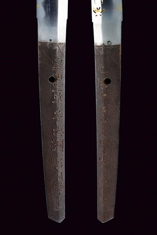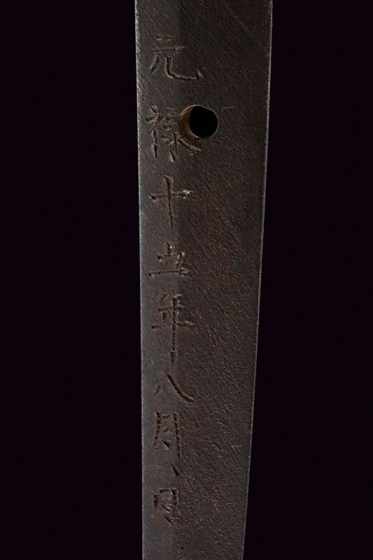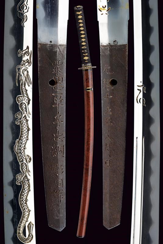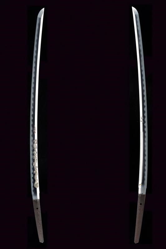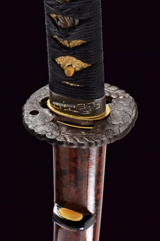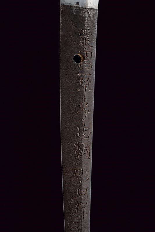 Giappone, lunghezza 94 cm. Periodo Edo (1603-1867) Lama Shinogi-zukuri, Iori-mune. Nagasa: 67,2 cm. Hamon e hada visibili. Nakago-jiri: Iriyamagata. Reca iscrizione Awataguchi Ikkanshi Tadatsuma hori do saku (gimei: firma non genuina). Un Mekugi-ana. Habaki in rame. Con bel koshirae d'epoca Edo tarda, recante Tsuba d'epoca Edo in ferro Maru-gata, lavorata a traforo e intaglio a foglie e con piccoli elementi dorati. Bel Fuchi sempre antico in shakudo con faretra in rilievo e con dorature. Menuki antichi con cinghiali. Tsuka, Kashira, Tsuka-ito e Same più recenti. Saya. Vecchia saya in legno laccata rossa con Kurigata postumo.