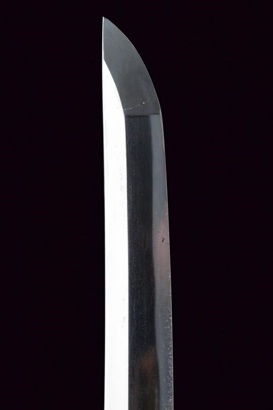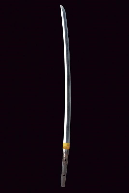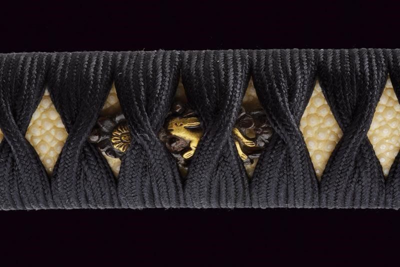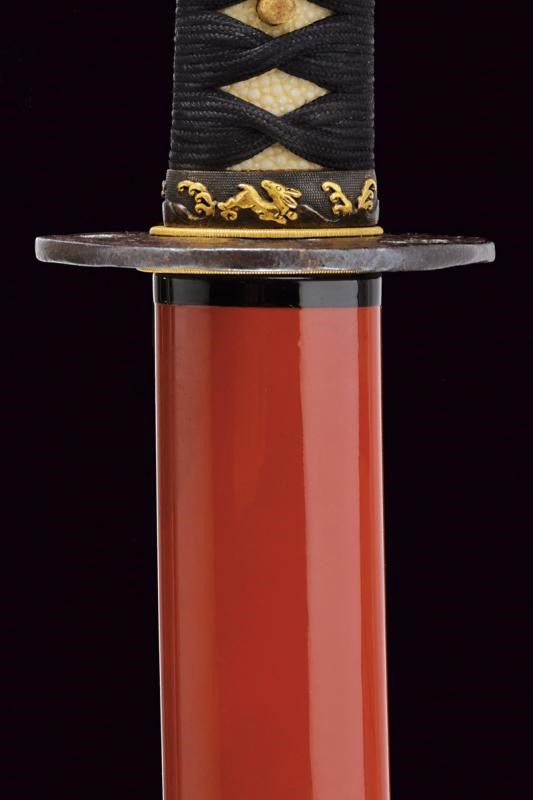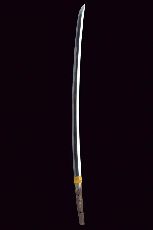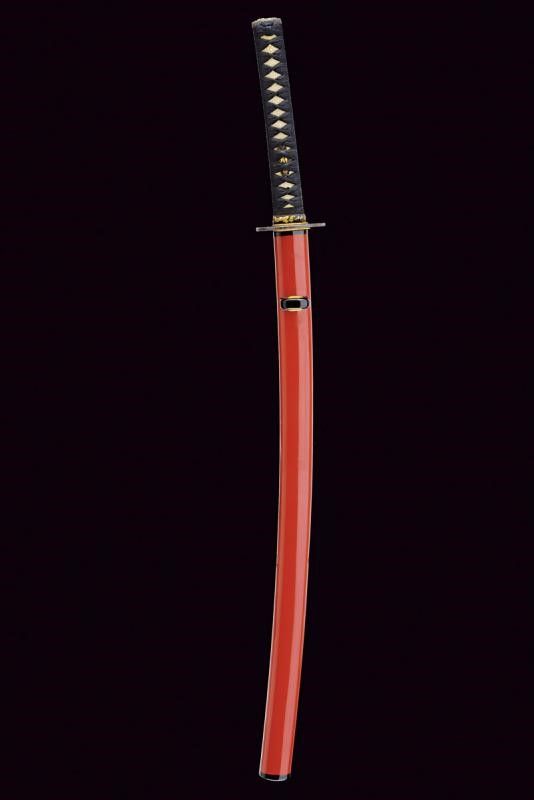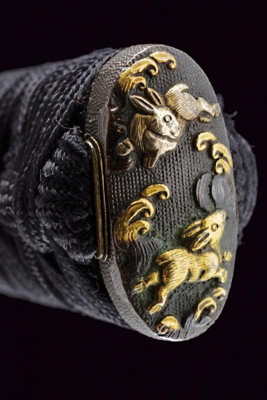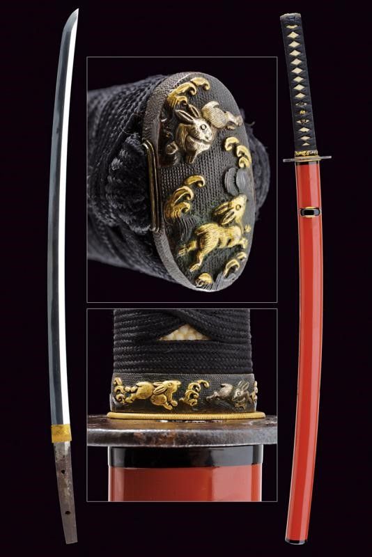 Giappone, lunghezza 86 cm. Periodo Muromachi (1392-1573) Lama Koto Shinogi-zukuri, Iori-mune . Nagasa: 60,5 cm. Hamon e hada visibili. Qualche kizu di tipo non grave. Nakago-suriage. Jiri: kiri. Mumei. Due Mekugi-ana. Habaki in metallo dorato. In Koshirae d'epoca Edo con Tsuba in ferro Maru-gata con trafori e tracce di agemine in oro. Bei Fuchi e Kashira in Shakudo ornati a temi di Usagi in Takazogan, oro e argento. Anche i Menuki antichi, con effigi di conigli. Tsuka più tarda. Saya più tarda in lacca rossa.