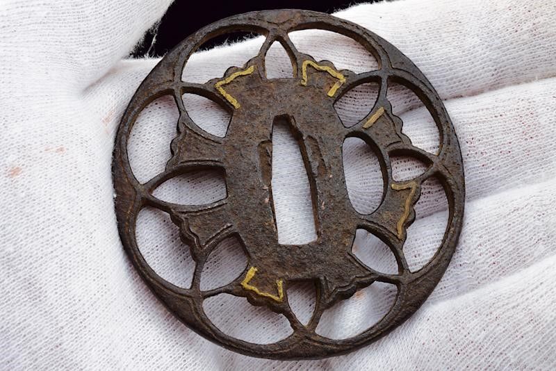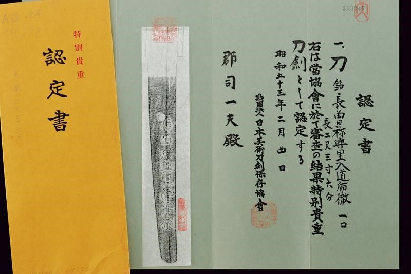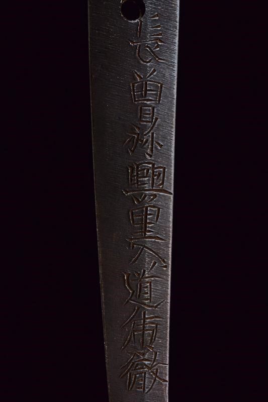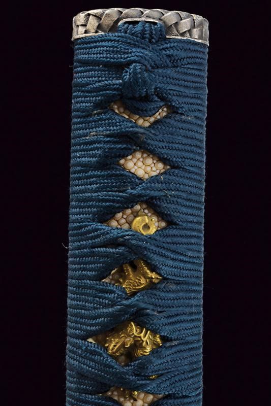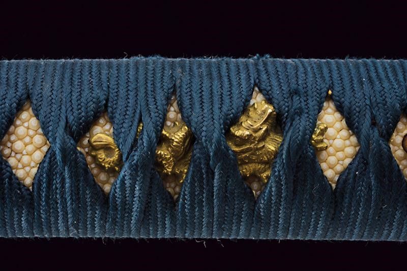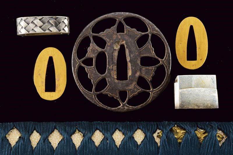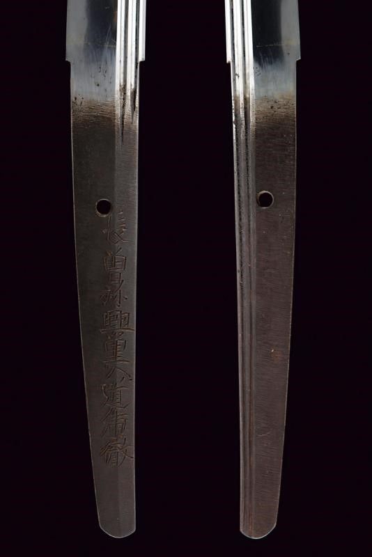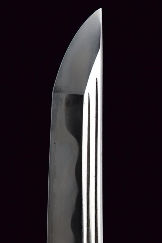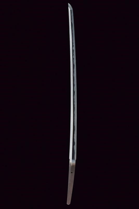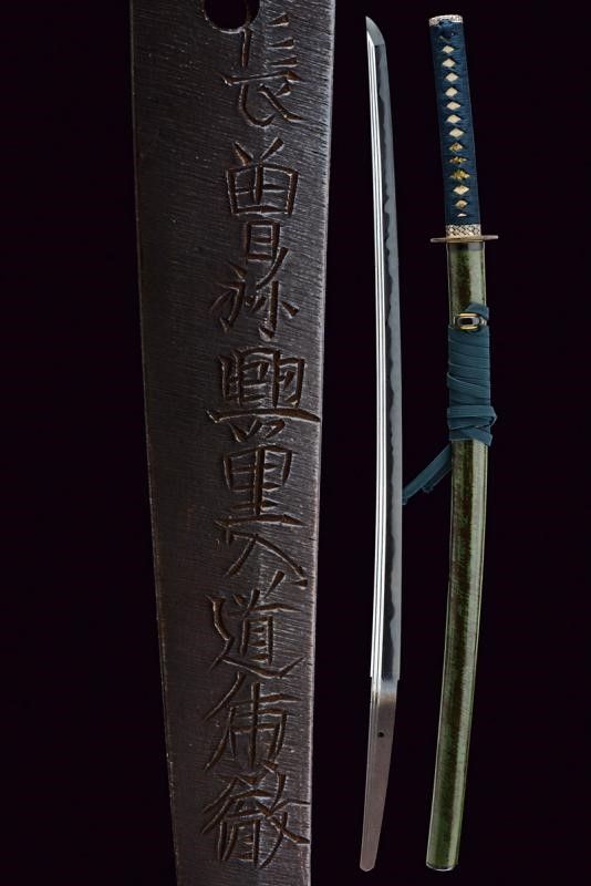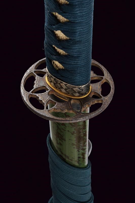 Giappone, lunghezza 97 cm. Lama Shinogi-zukuri, Iori-mune. Futasuji-hi. Nagasa: 71,5 cm. Hamon e hada ben visibili. Nakago-jiri: Ha-agari-kurijiri. Reca iscrizione: Nagasome Okisato Nyudo Kotetsu (Gimei, firma non genuina). Un Mekugi-ana. Utsushi Mono (copia). Lama molto tarda. Habaki in argento. In koshirae con Tsuba d'epoca Edo in ferro decorata a traforo. Fuchi e kashira in metallo color argento intagliati a imitare bambù intrecciato. Tsuka probabilmente più tarda con tsuka-ito color verde, Same in pelle di razza color bianco e Menuki in ottone a draghi. Anche la saya successiva, con fine rivestimento in lacca nera screziata color verde.