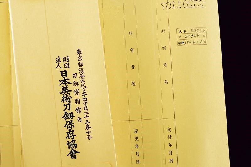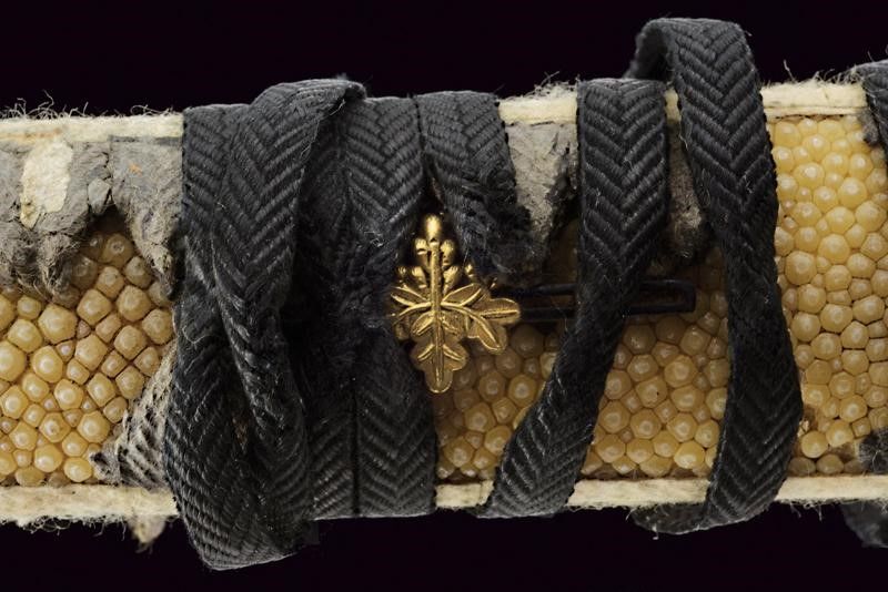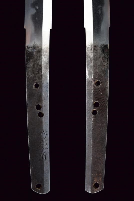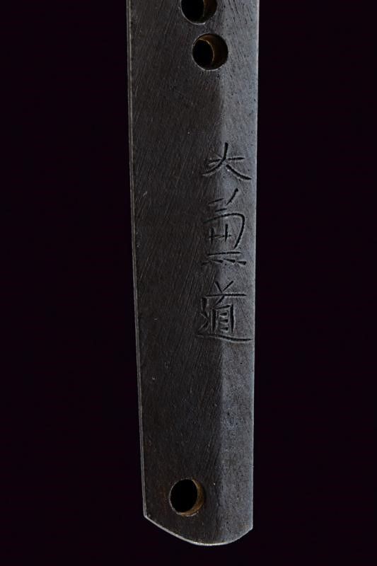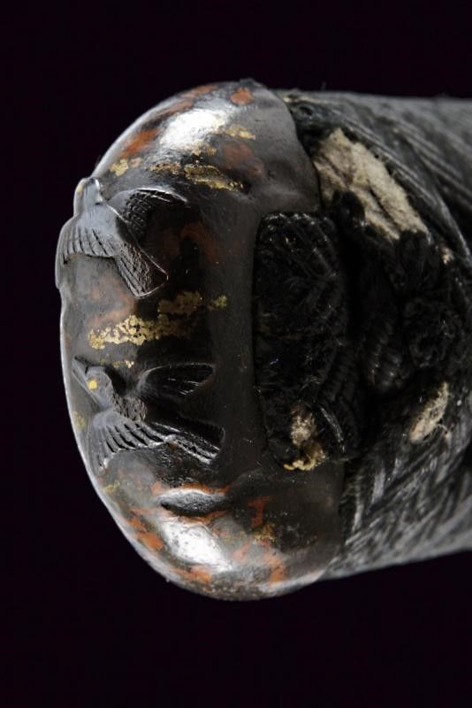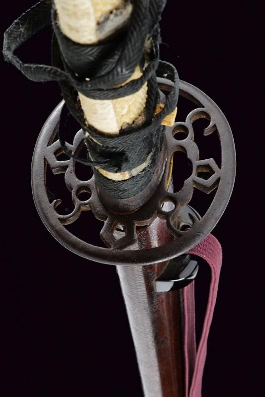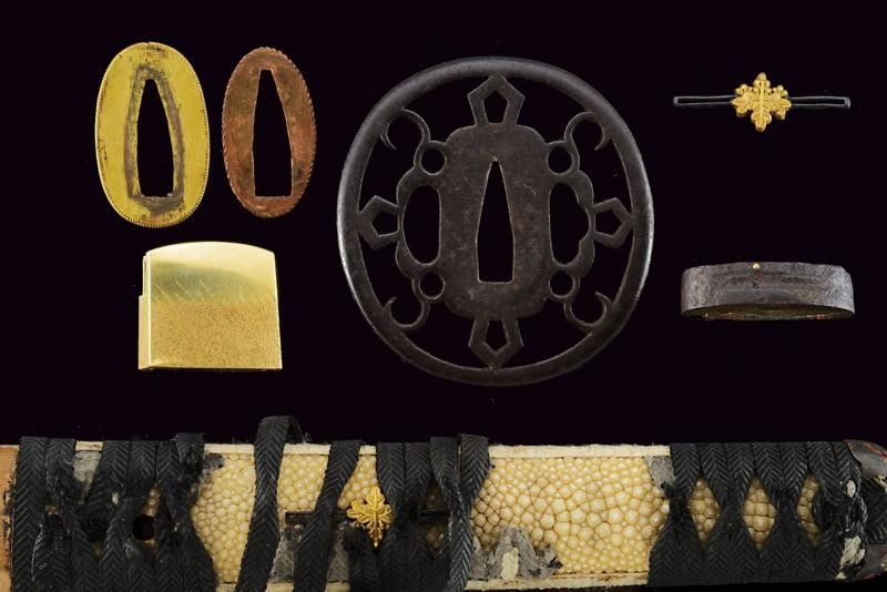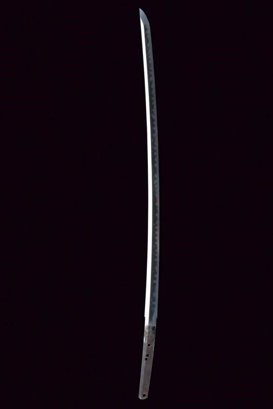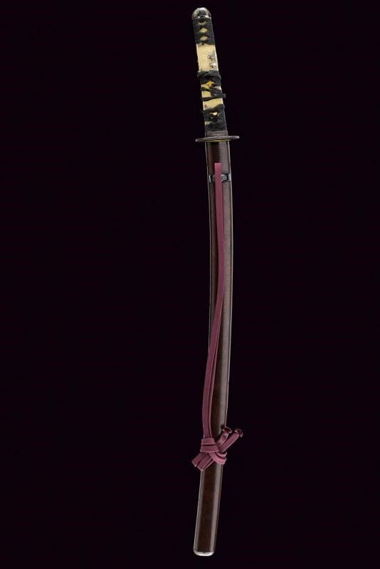 Giappone, lunghezza 94 cm. Periodo Edo (1603-1867) Lama Shinogi-zukuri, Iori-mune . Nagasa: 71 cm. Hamon e hada ben visibili. Nakago-jiri: Ha-agari-kurijiri. Mei: Daihoshi Kanemichi (Nidai). Scuola Mino. Quattro Mekugi-ana. Habaki in ottone. In koshirae con Tsuba Maru-gata in ferro traforato, d'epoca Edo. Fuchi in ferro, kashira in shakudo con uccelli in volo. Tsuka antica in condizioni cattive, con Same in pelle di razza, resti di Tsuka-ito in seta nera. Menuki dorati, lavorati a foglie (distaccati). Bella saya (successiva?) in lacca nera con venature rosse.
