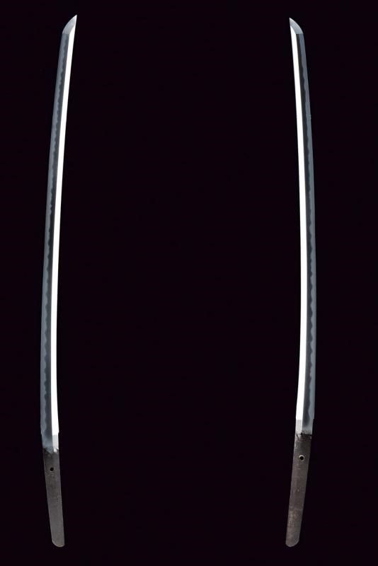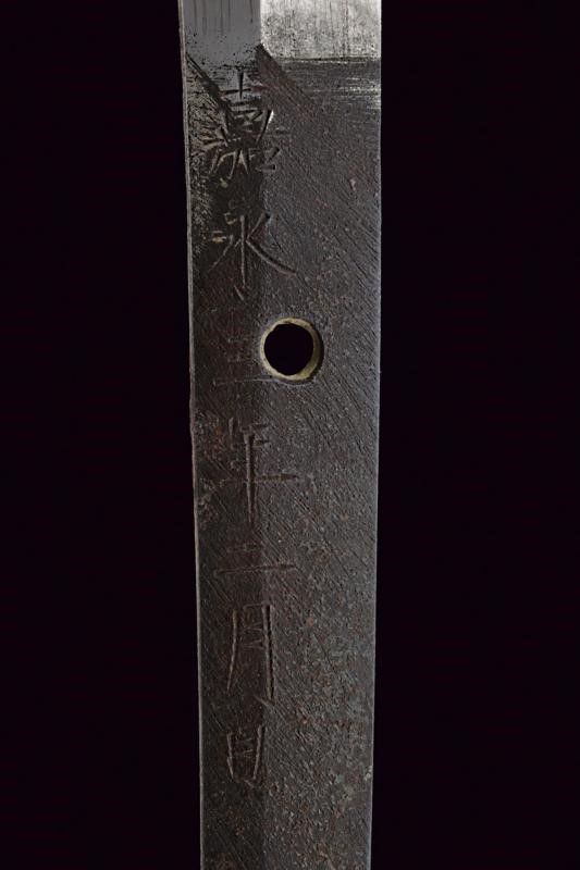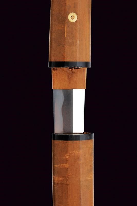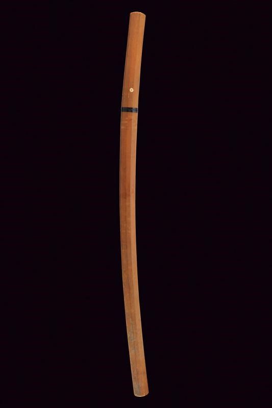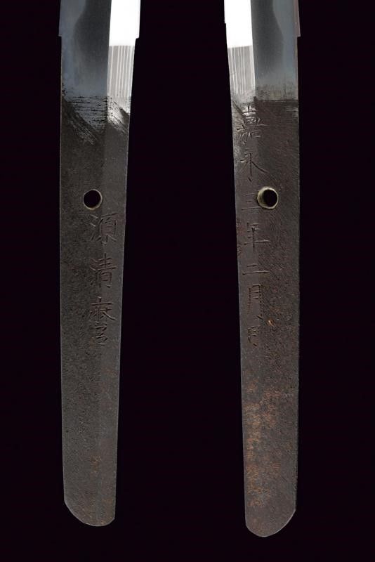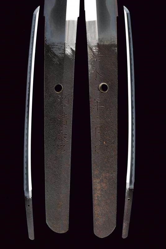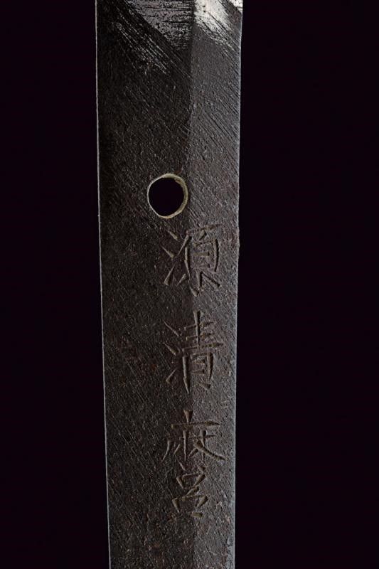 Giappone, lunghezza 95 cm. Periodo Edo (1603-1867) Lama Shinogi-zukuri, Iori-mune. Nagasa: 70,4 cm. Hamon e Hada ben visibili. Nakago jiri: Ha-agari-kurijiri. Recante l'scrizione: Minamoto Kiyomaro (gimei, firma spuria). Un Mekugi-ana. Epoca Shinshinto. Habaki in legno. Conservata in Shirasaya antico.