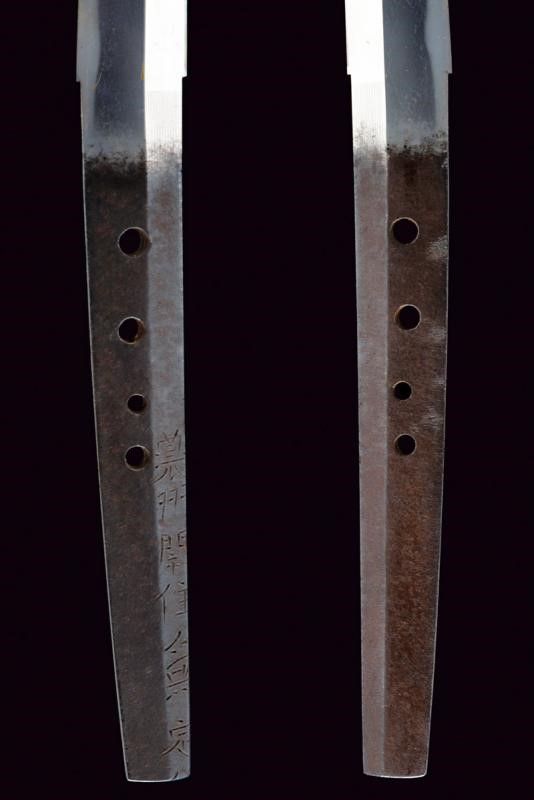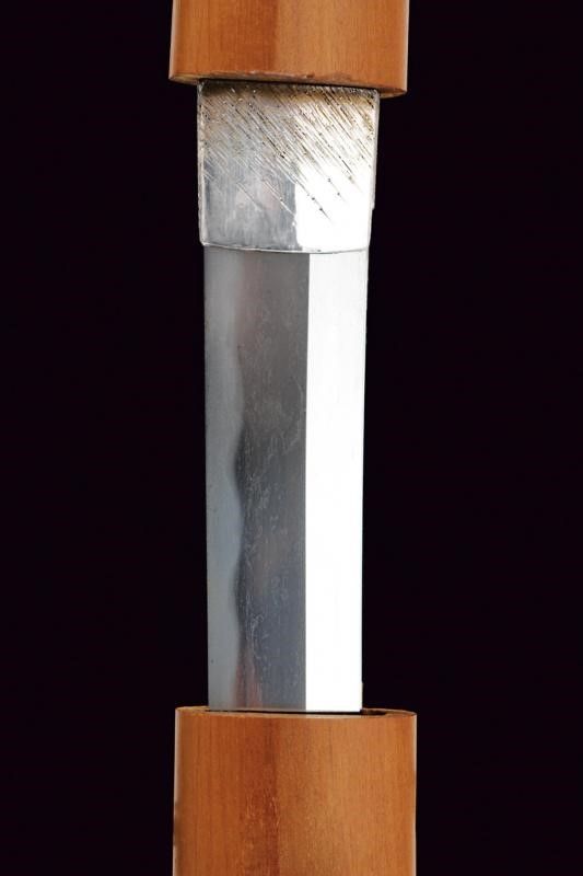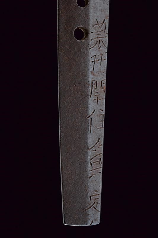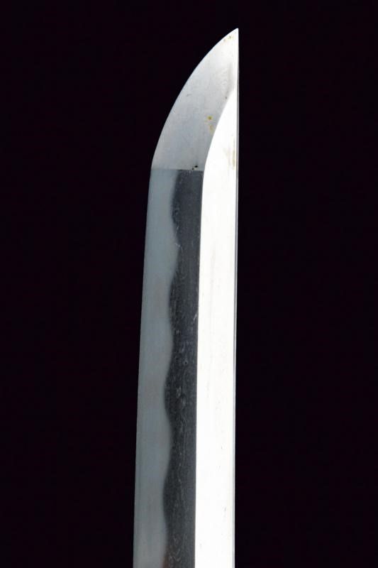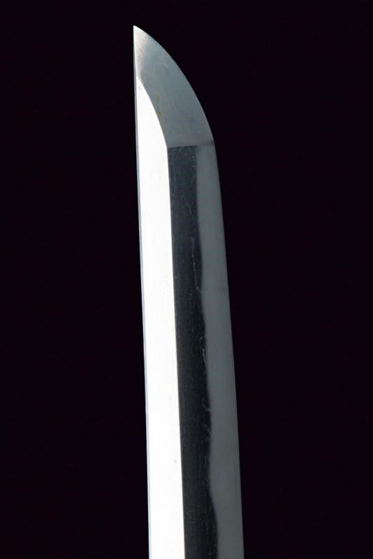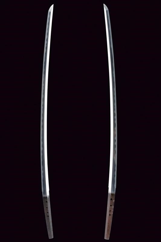 Giappone, lunghezza 95 cm. Periodo Muromachi (1392-1573) Snella ed elegante lama Shinogi-zukuri, Iori-mune. Nagasa: 70,4 cm. Hamon e hada ben visibili. Nakago-Osuriage. Jiri: Kiri. Mei: Noshu Seki ju Kanesada saku. Quattro Mekugi-ana. Tarda epoca Muromachi, XVI secolo. Habaki laminato in argento. Conservata in Shirasaya.