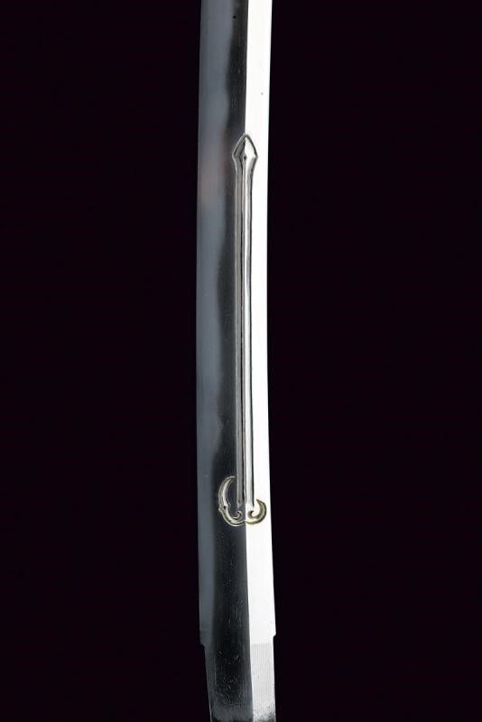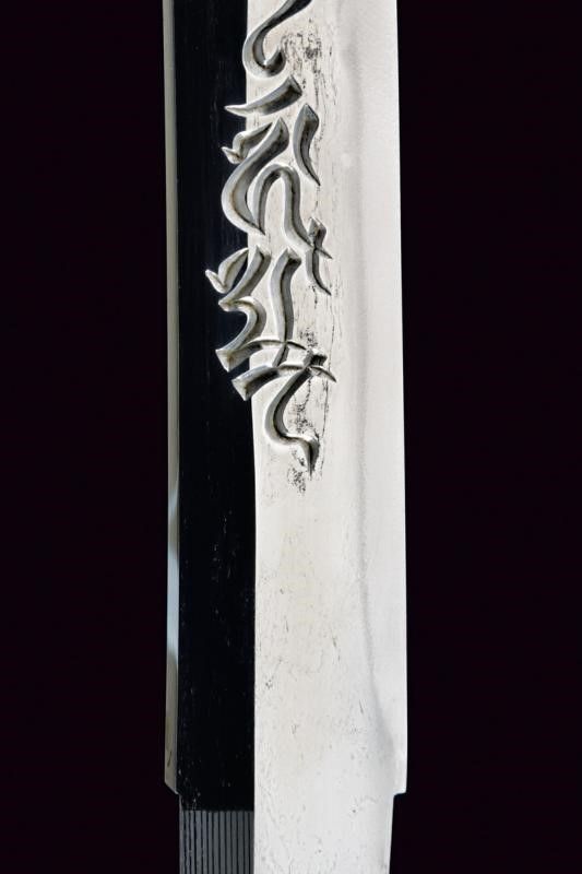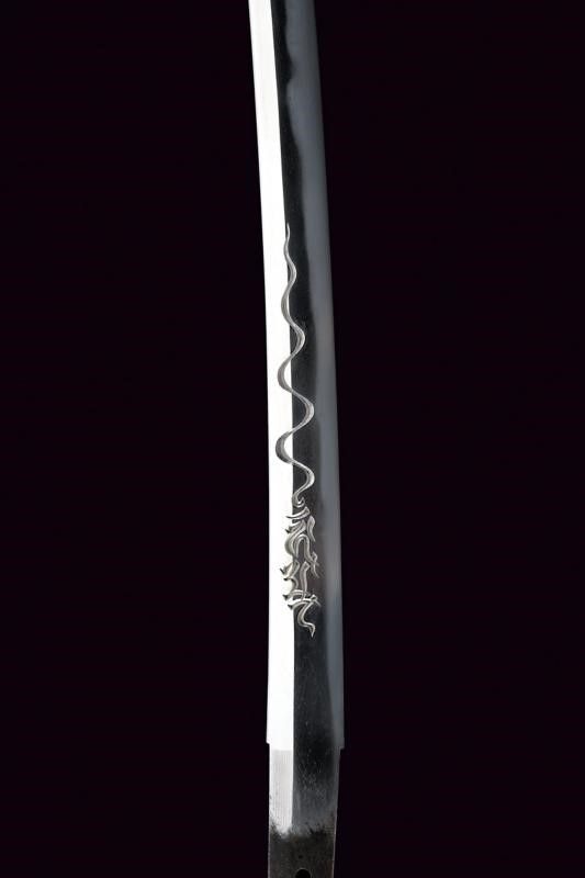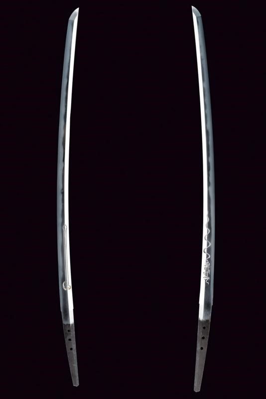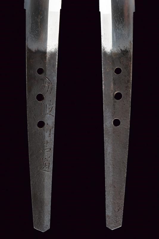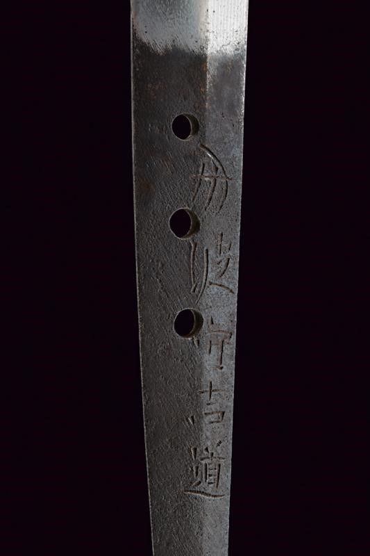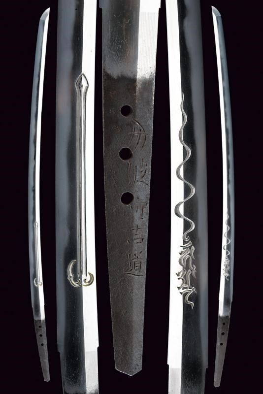 Giappone, lunghezza 90,5 cm. Periodo Edo (1603-1867) Lama Shinogi-zukuri, Iori-mune. Nagasa: 66,7 cm. Hamon e hada ben visibili. Due Horimono: a Ken e a caratteri. Nakago-jiri: Iriyamagata. Mei: Tanba no Kami Yoshimichi (forse gimei, non genuina). Epoca tardo Shinto XVIII secolo. Tre Mekugi-ana. Habaki in metallo dorato. Conservato in Shirasaya.